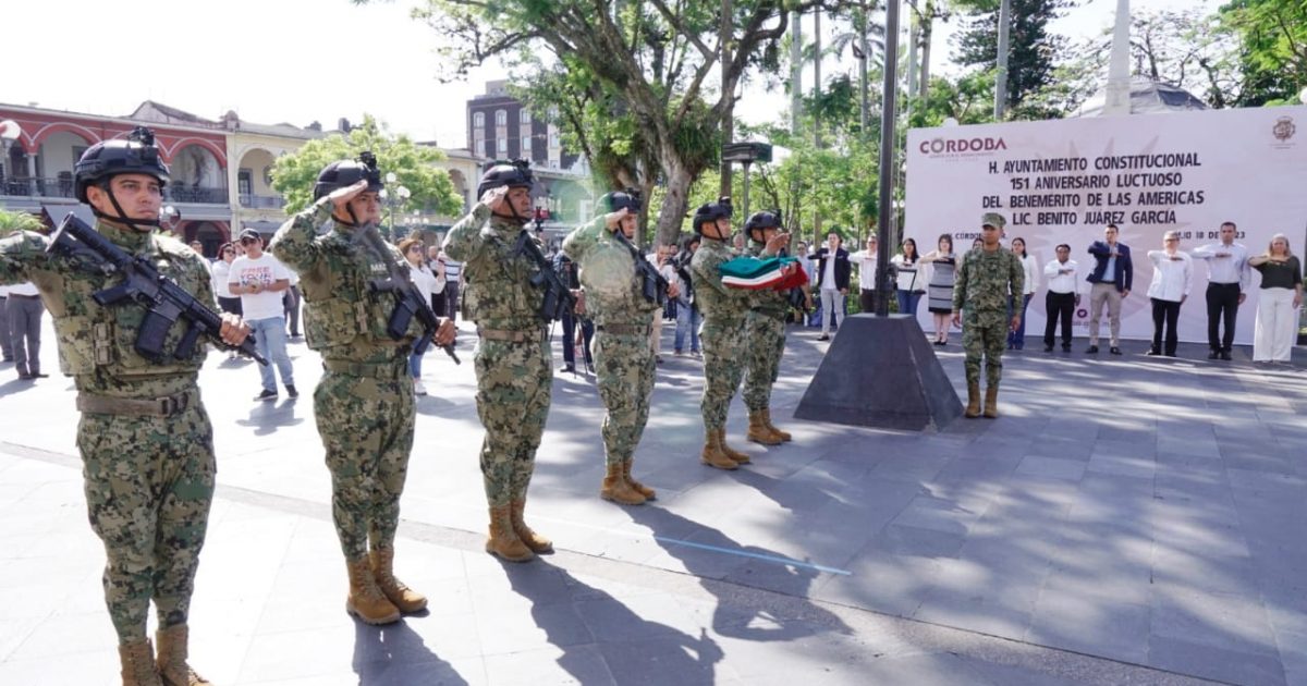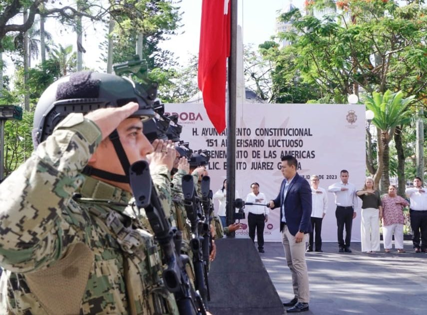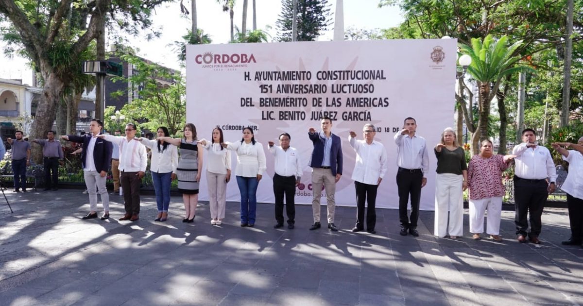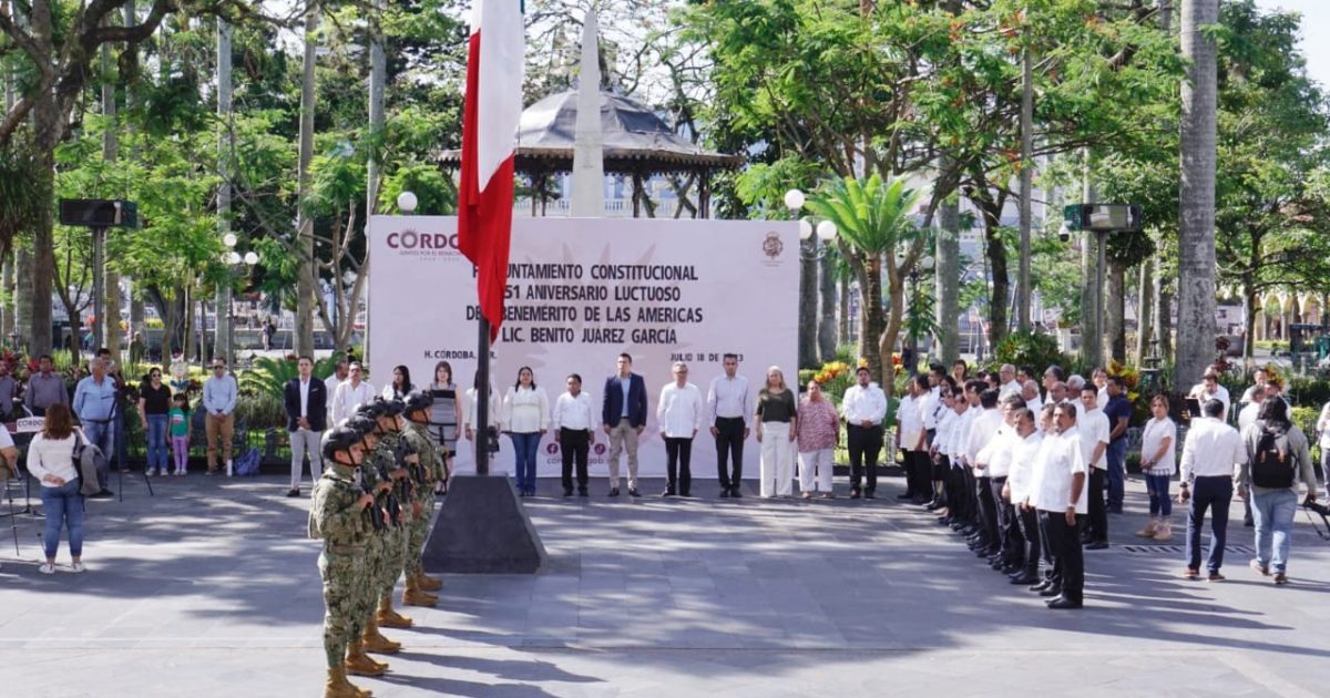 Córdoba, Ver., (18 de julio de 2023). – Con un acto cívico y colocación de ofrenda floral, autoridades municipales, encabezadas por el Presidente, Juan Martínez Flores y la Masonería Regional 24 de Agosto conmemoraron el 151 Aniversario Luctuoso del Benemérito de las América, Benito Pablo Juárez García.
