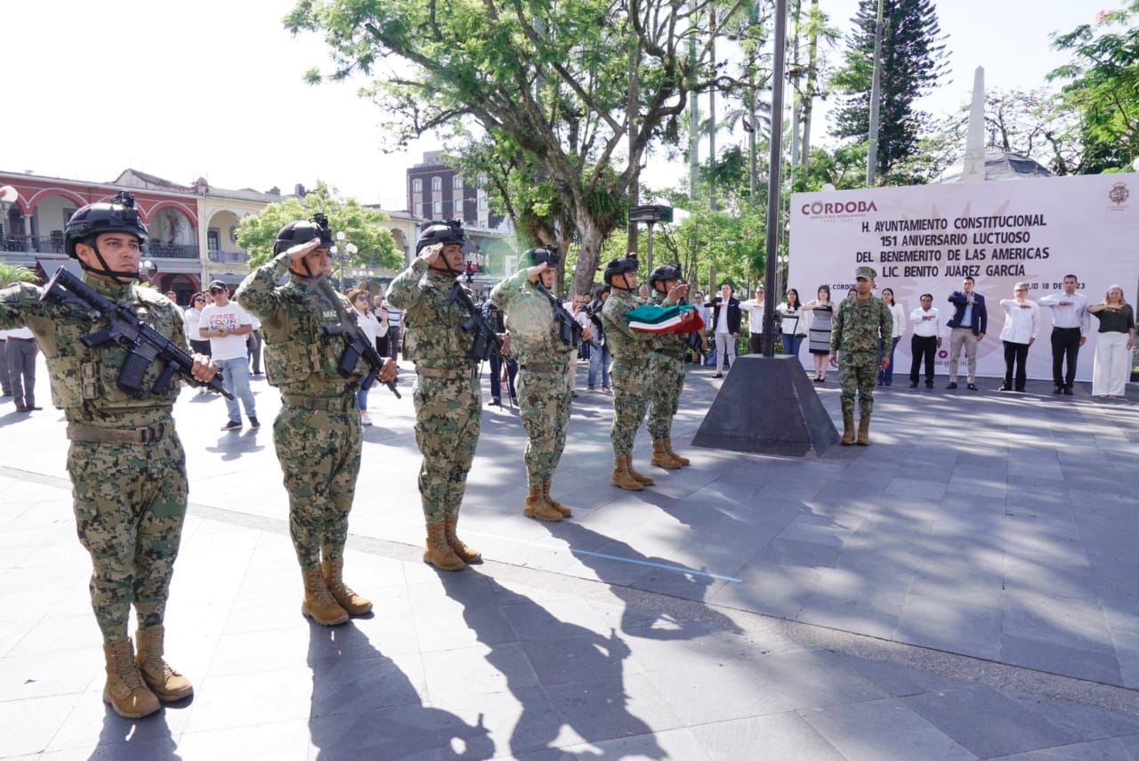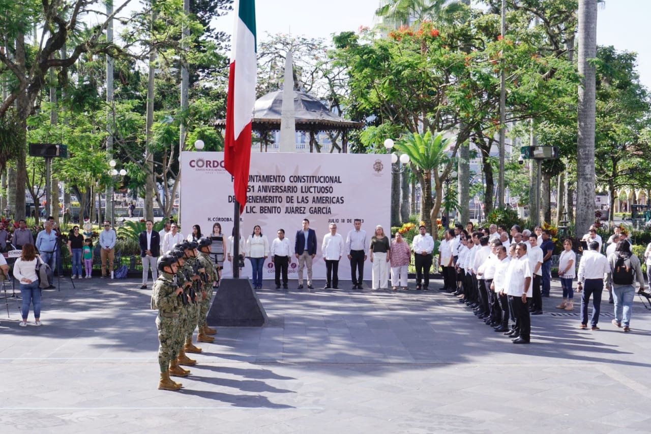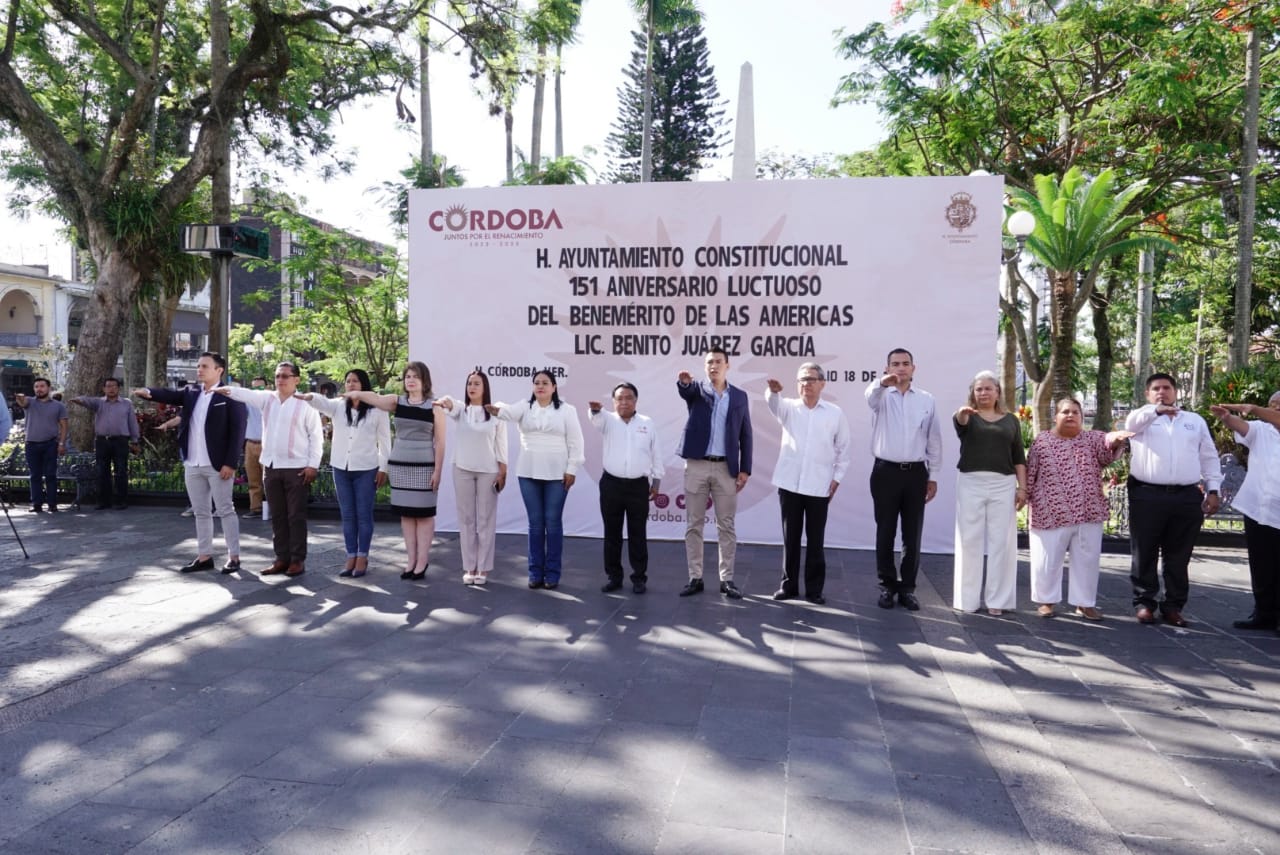 Córdoba, Ver., (18 de julio de 2023). – Con un acto cívico y colocación de ofrenda floral, autoridades municipales, encabezadas por el Presidente, Juan Martínez Flores y la Masonería Regional 24 de Agosto conmemoraron el 151 Aniversario Luctuoso del Benemérito de las América, Benito Pablo Juárez García.