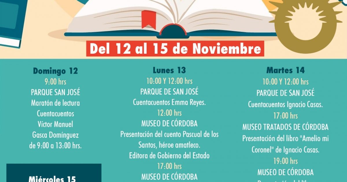 Este domingo 12 de noviembre, serán inauguradas las actividades a las 9:00 horas en el Parque San José, donde habrá un maratón de lectura hasta las 13:00 horas, con fragmentos del libro Leyendas de Córdoba de María García Esperón, finalizando con el cuenta cuentos, a cargo del alumno Víctor Manuel Gasca Domínguez, ganador en este año del concurso estatal “Y Me Encontré Un Cuentacuentos”, que representa a la escuela telesecundaria vespertina Emilio Carballido y quien presentará el cuento “la gallina degollada” del autor Horario Quiroga.