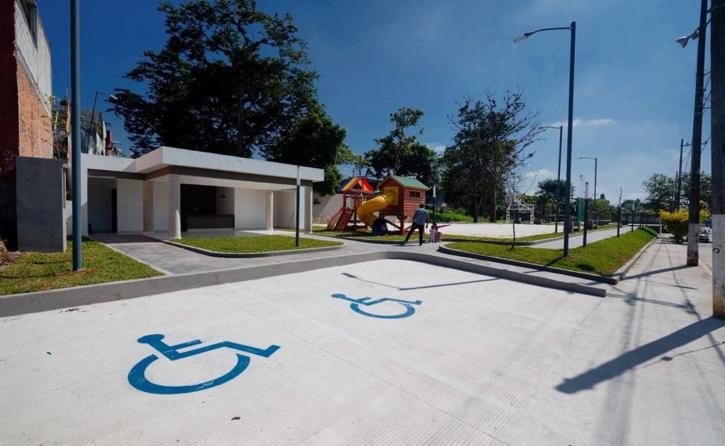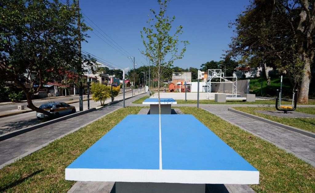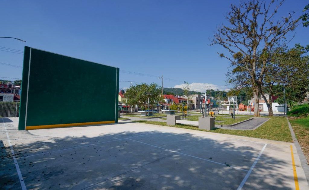 La obra cuenta con cafetería, área de gimnasio, mesas de pin pon, cancha de usos múltiples para disciplinas como basquetbol y fútbol, además de una cancha de frontón, juegos infantiles, sanitarios, andadores de concreto estampado y luminarias para garantizar la seguridad de los asistentes.