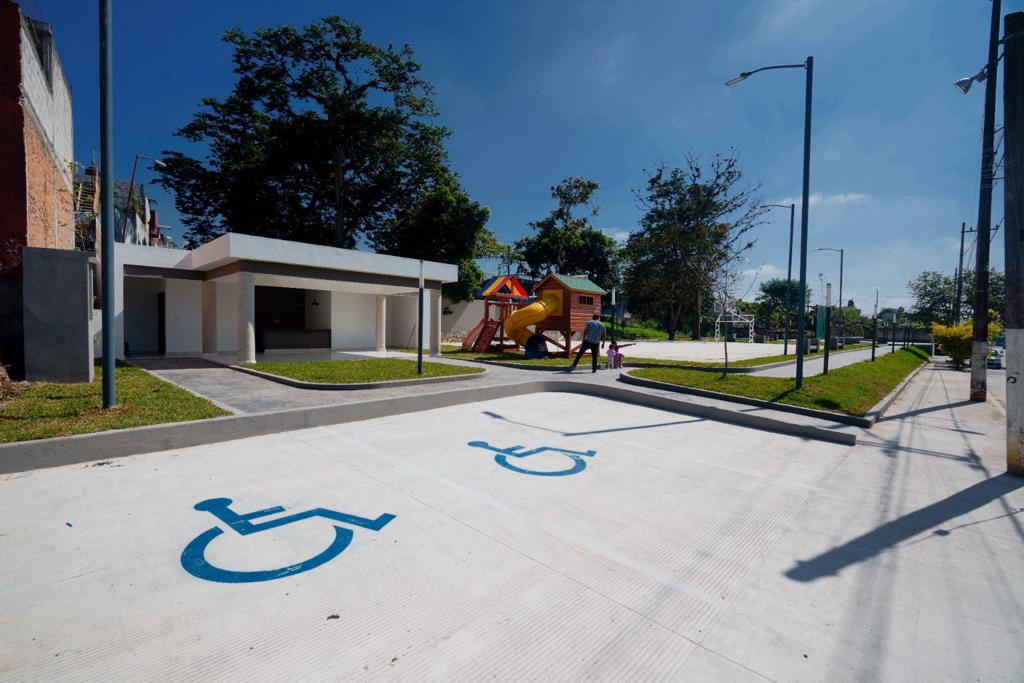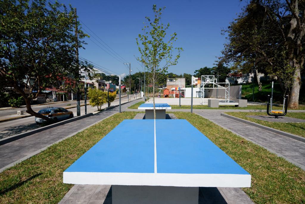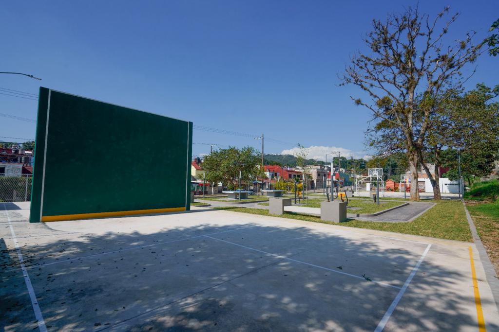 La obra cuenta con cafetería, área de gimnasio, mesas de pin pon, cancha de usos múltiples para disciplinas como basquetbol y fútbol, además de una cancha de frontón, juegos infantiles, sanitarios, andadores de concreto estampado y luminarias para garantizar la seguridad de los asistentes.