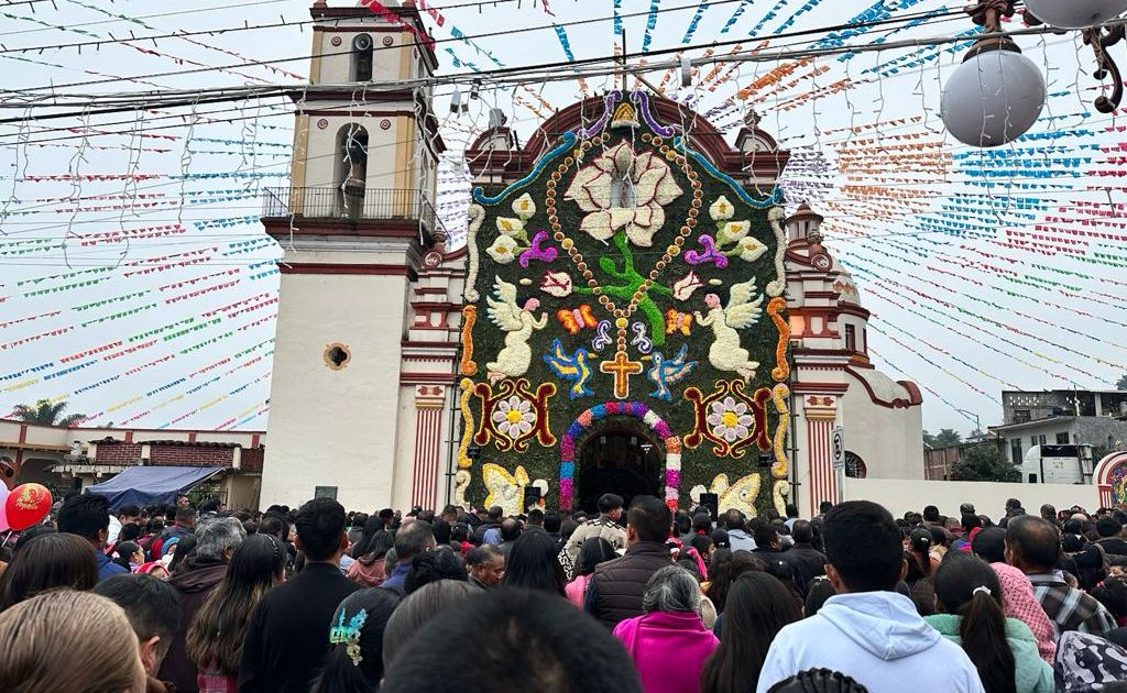 La Perla, Ver.- El obispo de Orizaba, Eduardo Cervantes Merino; la presidente municipal de La Perla, Ruth García Meza, así como integrantes de la mayordomía y cientos de devotos recorrieron los tapetes de aserrín multicolores, para concluir con la Eucaristía en la Parroquia Santa María de Guadalupe que fue adornada con 1.5 millones de flores. En el frontispicio luce una obra de arte creada por artesanos de las comunidades.