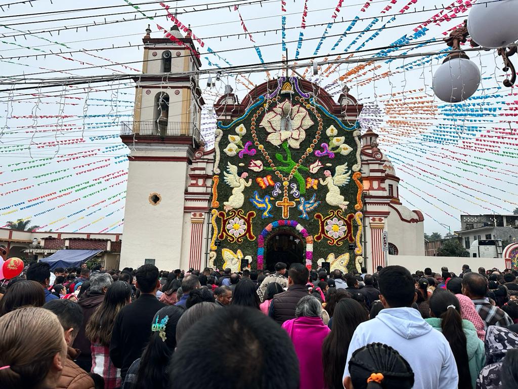La Perla, Ver.- El obispo de Orizaba, Eduardo Cervantes Merino; la presidente municipal de La Perla, Ruth García Meza, así como integrantes de la mayordomía y cientos de devotos recorrieron los tapetes de aserrín multicolores, para concluir con la Eucaristía en la Parroquia Santa María de Guadalupe que fue adornada con 1.5 millones de flores. En el frontispicio luce una obra de arte creada por artesanos de las comunidades.