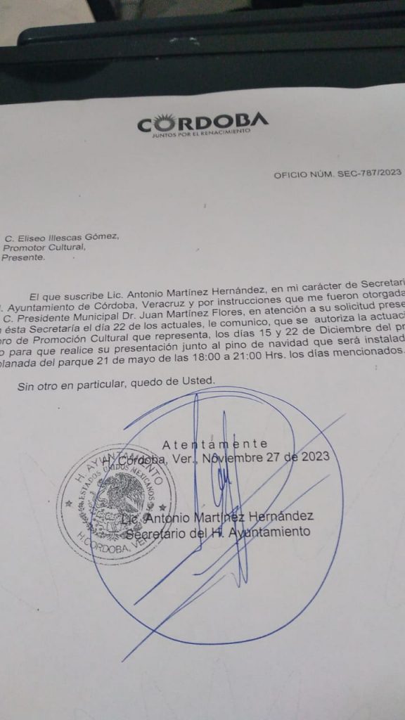 Córdoba,  Ver. – A pesar de contar con la autorización del uso del Parque 21 de Mayo, de las 18:00 a las 21:00 horas los días 15 y 22 de diciembre según consta en el oficio SEC/787/2023 que se emitió el pasado 27 de noviembre, a menos de 36 horas el secretario del ayuntamiento dio marcha atrás a la autorización que se había otorgado a Eliseo Illescas promotor cultural de la sociedad civil, quien había organizado un “Concierto por La Paz” a capella.