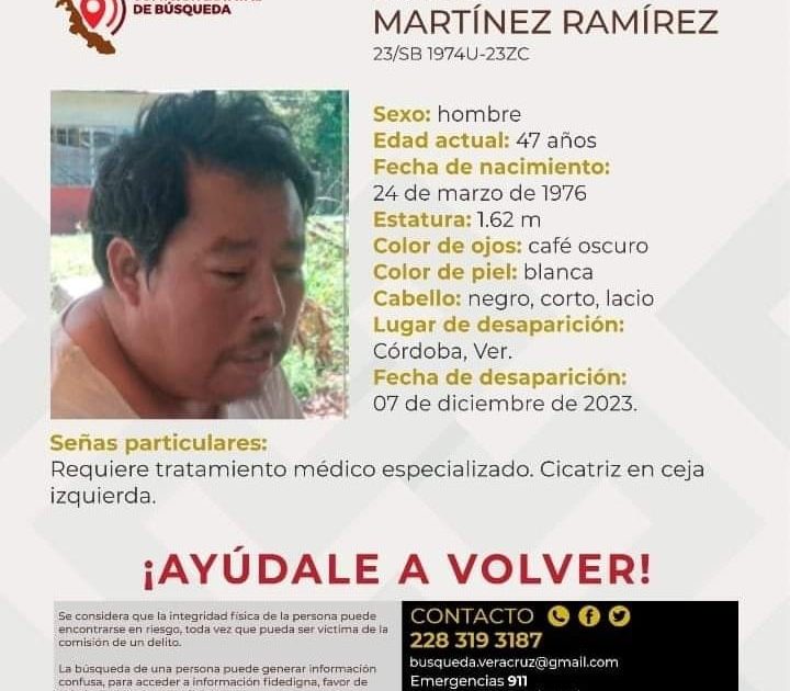 Córdoba, Ver. – A través de la Comisión Estatal de Búsqueda Veracruz, se solicita la intervención de las autoridades para poder localizar a Simón Martínez Ramírez, de 47 años, el cual es reportado como desaparecido en la ciudad de Córdoba.