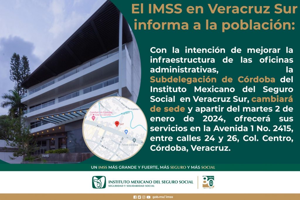 Con la intención de mejorar la infraestructura de las oficinas administrativas, la Subdelegación de Córdoba del Instituto Mexicano del Seguro Social (IMSS) en Veracruz Sur, cambiará de sede y a partir del martes 2 de enero ofrecerá sus servicios en la Avenida 1 No. 2415, entre calles 24 y 26, Col. Centro, Córdoba, Veracruz.