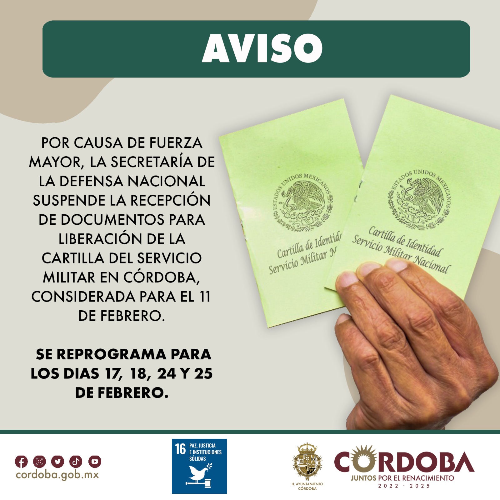 H. Córdoba, Ver. 10 de febrero de 2024. – La Junta Municipal de Reclutamiento de Córdoba, da a conocer que por instrucciones de la Comandancia del 63 Batallón de Infantería,…