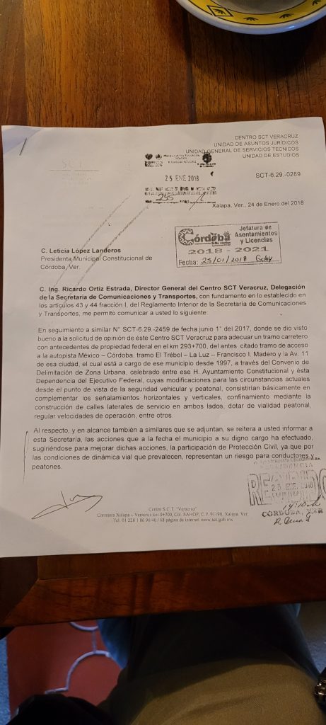 Recordó que cuando este tramo era federal se tenia que contar con un permiso de parte de la Secretaría de Comunicaciónes y Transporte, mismo que queda sin efecto al momento que el gobierno federal entrega en comodato al municipio cordobés este tramo carretero.