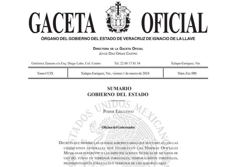 El día 1 de marzo del presente, se publicó en la Gaceta Oficial, Órgano del Gobierno del Estado de Veracruz de Ignacio de la Llave, Núm. Ext. 090, Tomo CCIX, el “DECRETO QUE PROHÍBE LAS QUEMAS AGROPECUARIAS QUE NO CUMPLAN CON LAS CONDICIONES GENERALES QUE ESTABLECEN LAS NORMAS OFICIALES MEXICANAS REFERENTE A LAS ESPECIFICACIONES TÉCNICAS DE MÉTODOS DE USO DEL FUEGO EN LOS TERRENOS FORESTALES, TEMPORALMENTE FORESTALES, PREFERENTEMENTE FORESTALES Y TERRENOS DE USO AGROPECUARIO”.