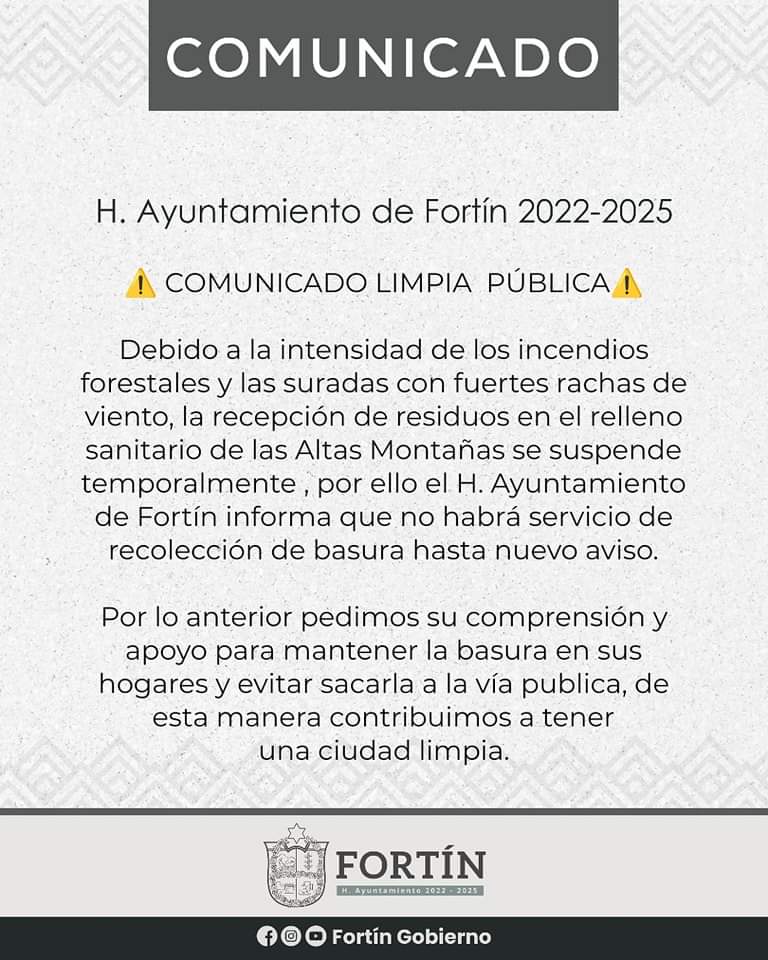 ⚠️COMUNICADO LIMPIA PÚBLICA⚠️ 🔸Debido a la intensidad de los incendios forestales y las suradas con fuertes rachas de viento, la recepción de residuos en el relleno sanitario de las Altas…
