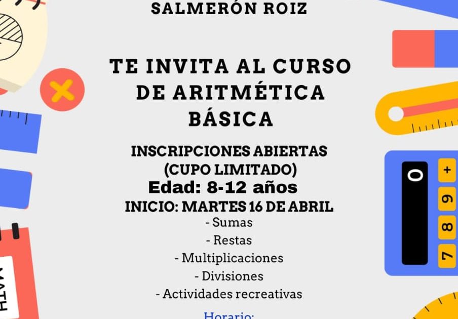 En la biblioteca: “Dr. Fernando Salmerón Roiz” el curso “Aritmética Básico” inicia el martes 16 de abril, y se impartirá en horario de 15:00 a 17:00 los días martes y viernes, el cupo es limitado y se ofrecen mayores informes al teléfono 2717143344 o en las instalaciones de la misma, ubicada en Av. Santa Rosa, Esq. Calle San Miguel S/N. de San Román.