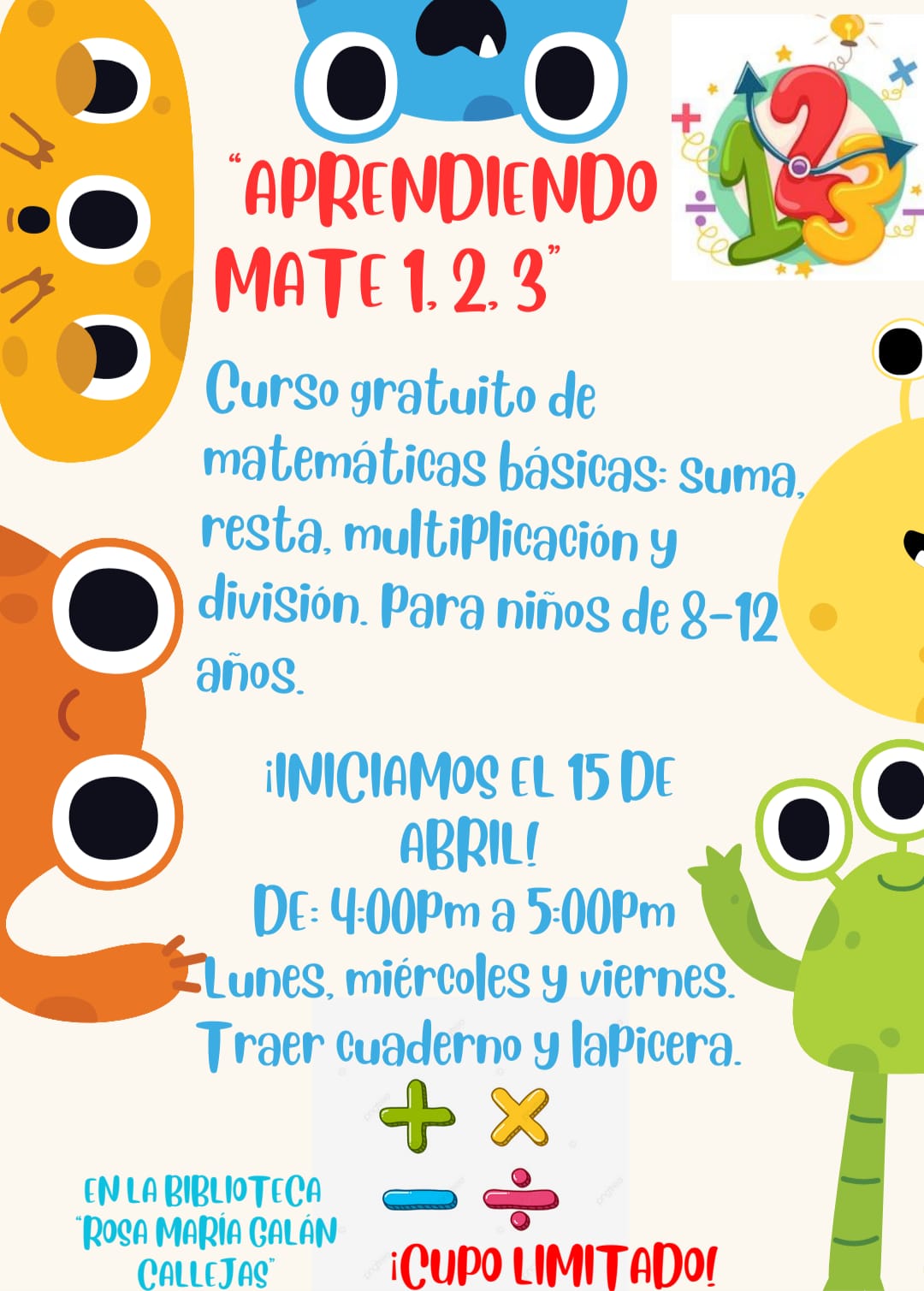 En la biblioteca “Rosa María Galán Callejas” las actividades iniciarán el día 15 de abril en horario de las 16:00 a las 17:00, las clases serán los días lunes miércoles y viernes y el único requisito es que lleven su lapicera y un cuaderno; se les enseñará las operaciones básicas de sumas, restas, multiplicación y división. Más informes en la biblioteca localizada en calle Tulipán 35A entre avenidas gladiola y girasol unidad Vista Hermosa.