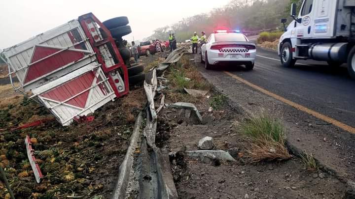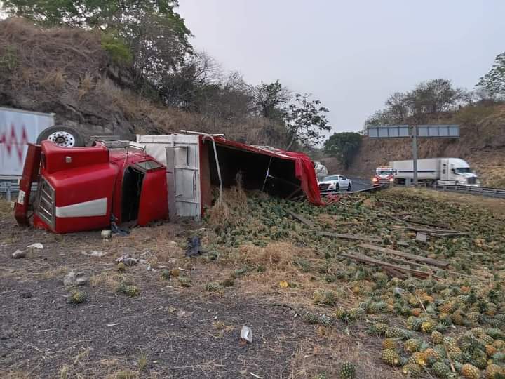 Cotaxtla, Ver.- La mañana de este jueves en el kilómetro 0+200 de la autopista a Veracruz, a la altura del libramiento de la autopista Córdoba y la Tinaja-Ciudad Isla, un torton cargado con piñas volcó saliéndose de la superficie de rodamiento dejando tirada su carga en el lugar.
