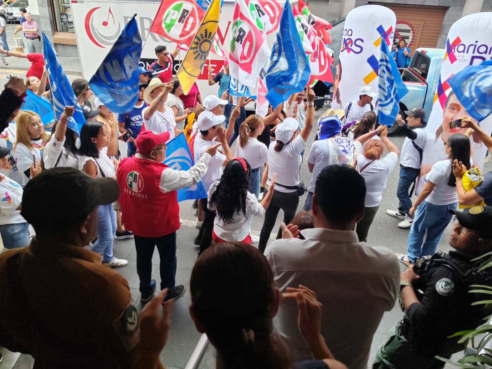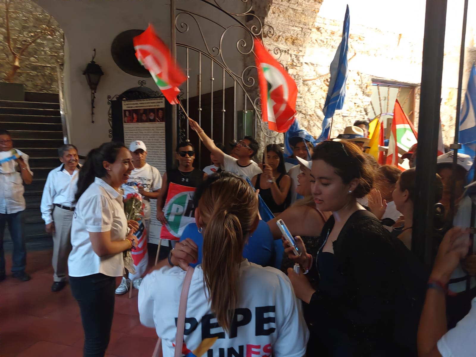 La abanderada el PAN, PRI y PRD fue recibida al final del debate por porras y muestras de apoyo por parte de simpatizantes de los partidos de la coalición, encabezados por sus presidente del partido, además de familia, amigos y ciudadanos que se sumaron a este triunfo de Mariana Ríos.