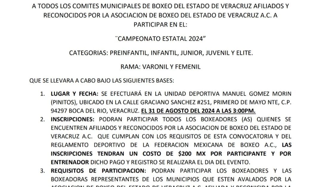 1.- Convocan a las categorías pre-infantil, infantil, Junior’s, juvenil y élite en sus dos ramas varonil y femenil a una eliminatoria llamada “Campeonato Estatal 2024” la cual según su convocatoria se eliminarían todos los boxeadores en 1 solo día y así sacar la selección que nos representaría en el “ll Festival Olímpico de Boxeo Pre-infantiles y Escolares 2024” y en el “II Gran Prix de Boxeo Élite Femenil y Varonil 2024”.