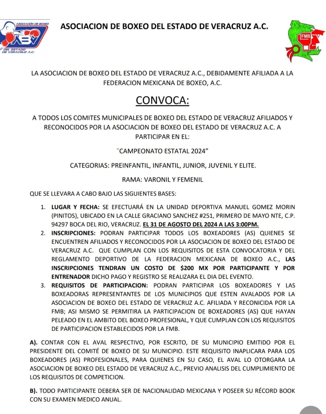 1.- Convocan a las categorías pre-infantil, infantil, Junior’s, juvenil y élite en sus dos ramas varonil y femenil a una eliminatoria llamada “Campeonato Estatal 2024” la cual según su convocatoria se eliminarían todos los boxeadores en 1 solo día y así sacar la selección que nos representaría en el “ll Festival Olímpico de Boxeo Pre-infantiles y Escolares 2024” y en el “II Gran Prix de Boxeo Élite Femenil y Varonil 2024”.