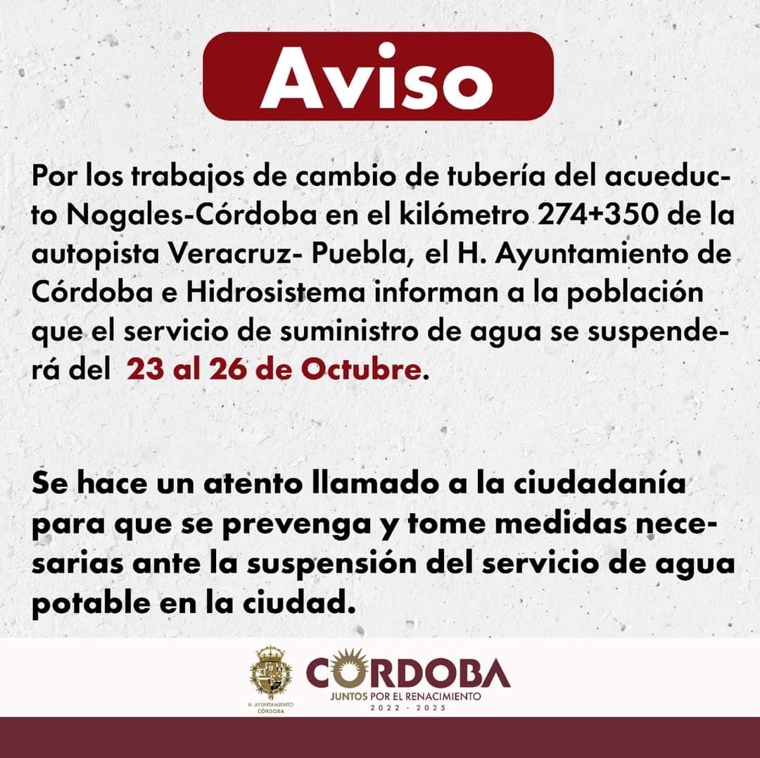 Córdoba, Ver., 20 de octubre de 2024. El Ayuntamiento e Hidrosistema de Córdoba hacen un llamado a la ciudadanía para que tome medidas necesarias ante la suspensión del servicio de…