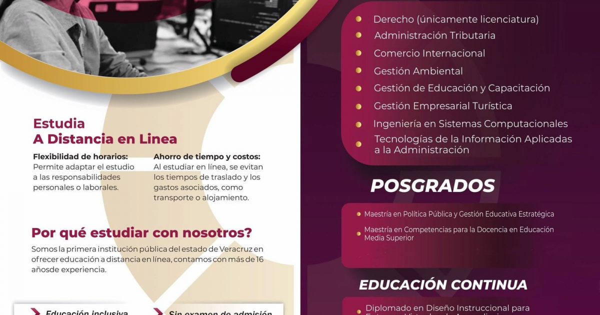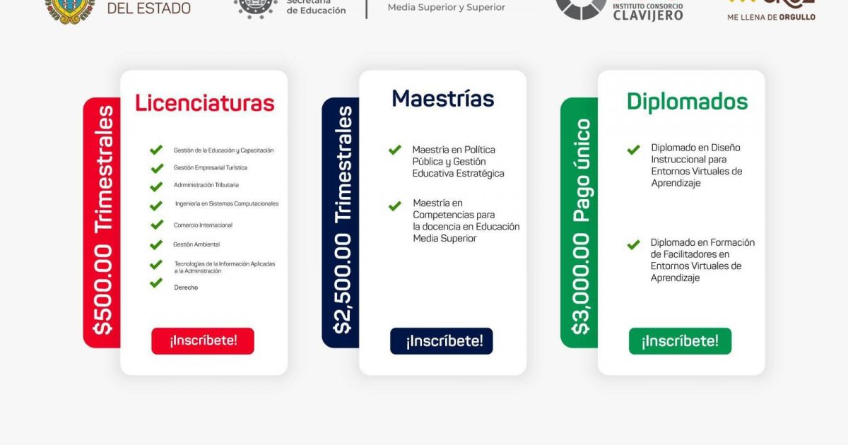 Entre las licenciaturas en línea disponibles, Ventura Ramírez mencionó opciones como Derecho, Ingeniería en Gestión Empresarial, Ingeniería en Sistemas Computacionales, Gestión en Educación y Capacitación, Administración Tributaria, Comercio Internacional, Tecnologías de la Información Aplicadas a la Administración, y Gestión Ambiental. Asimismo, las maestrías ofrecidas son Política Pública y Gestión Educativa Estratégica, y Competencias para la Docencia en Educación Media Superior.