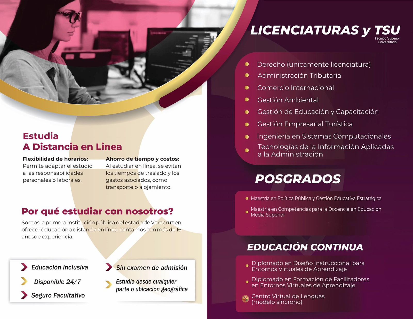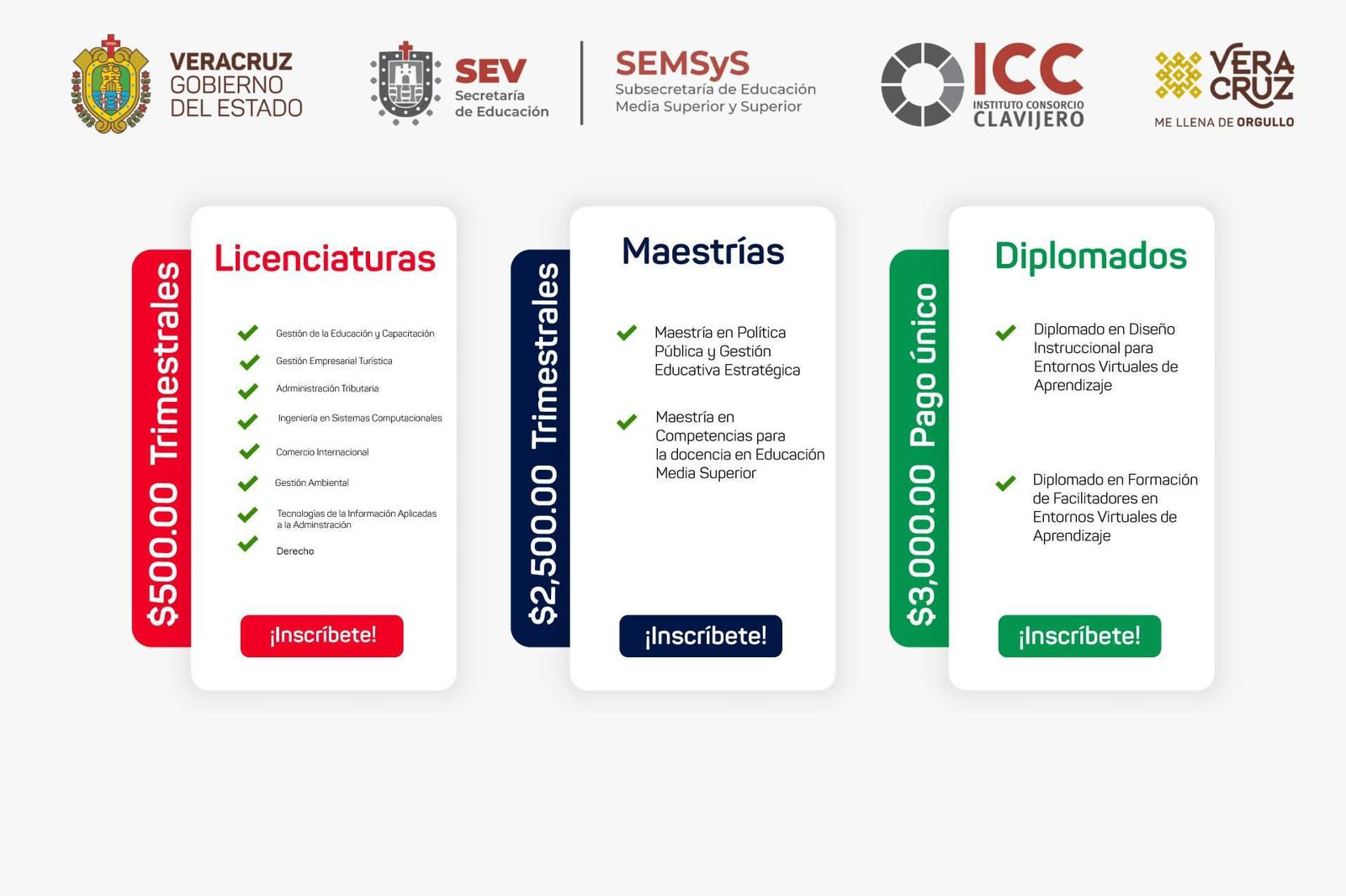 Entre las licenciaturas en línea disponibles, Ventura Ramírez mencionó opciones como Derecho, Ingeniería en Gestión Empresarial, Ingeniería en Sistemas Computacionales, Gestión en Educación y Capacitación, Administración Tributaria, Comercio Internacional, Tecnologías de la Información Aplicadas a la Administración, y Gestión Ambiental. Asimismo, las maestrías ofrecidas son Política Pública y Gestión Educativa Estratégica, y Competencias para la Docencia en Educación Media Superior.