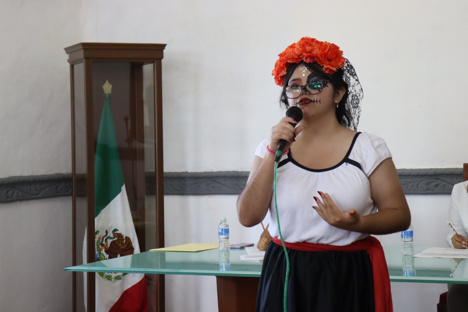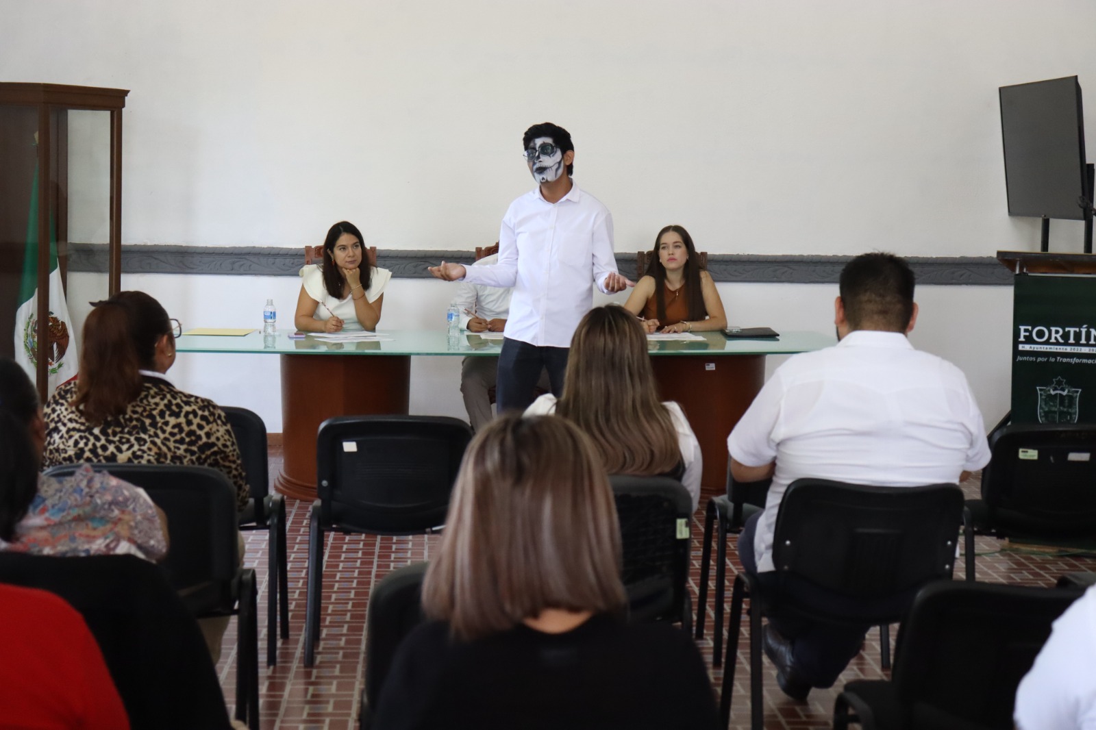 Los alumnos, caracterizados como catrines y catrinas, demostraron sus habilidades oratorias en la Sala de Cabildo del H. Ayuntamiento de Fortín, acompañados de sus familiares y maestros.