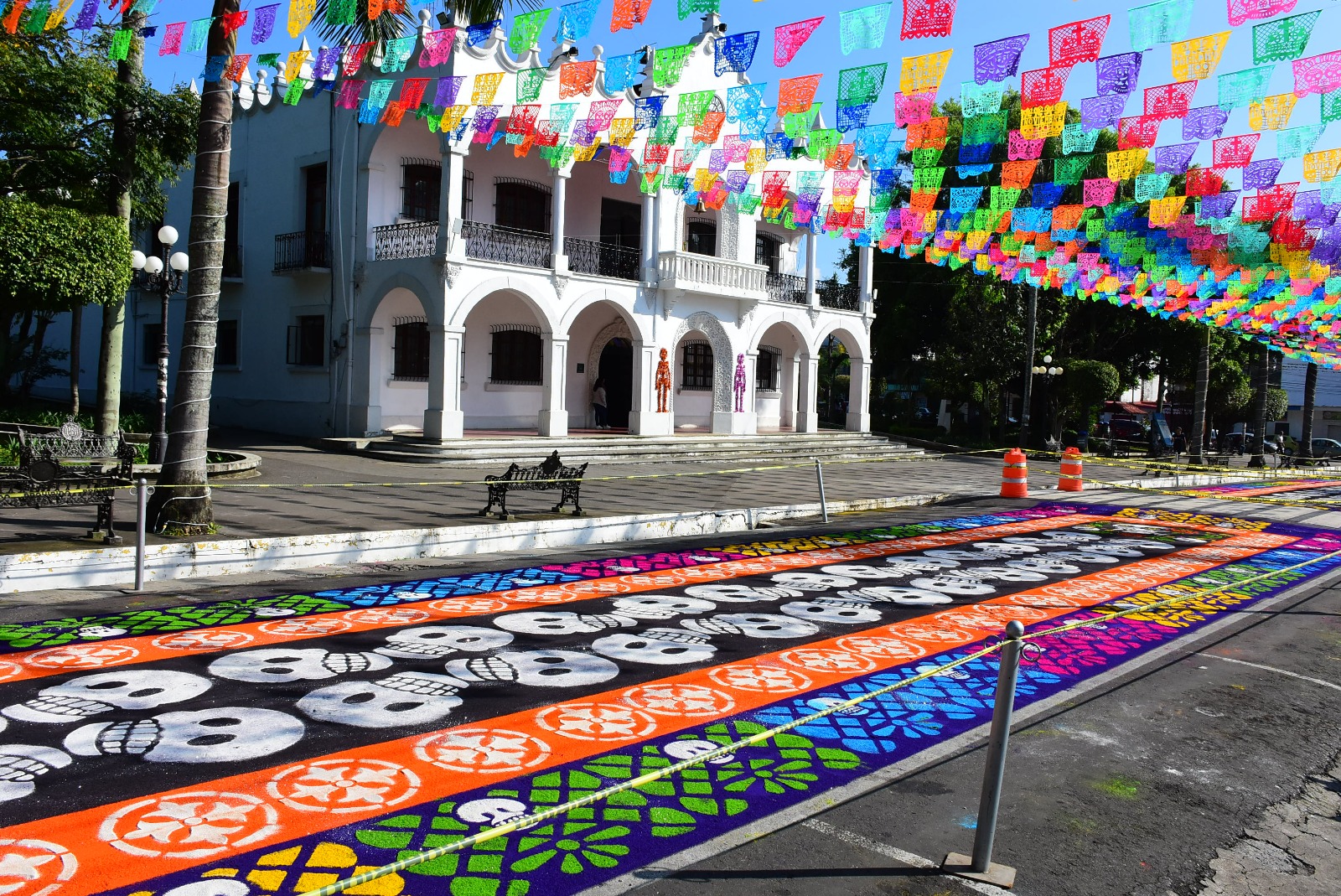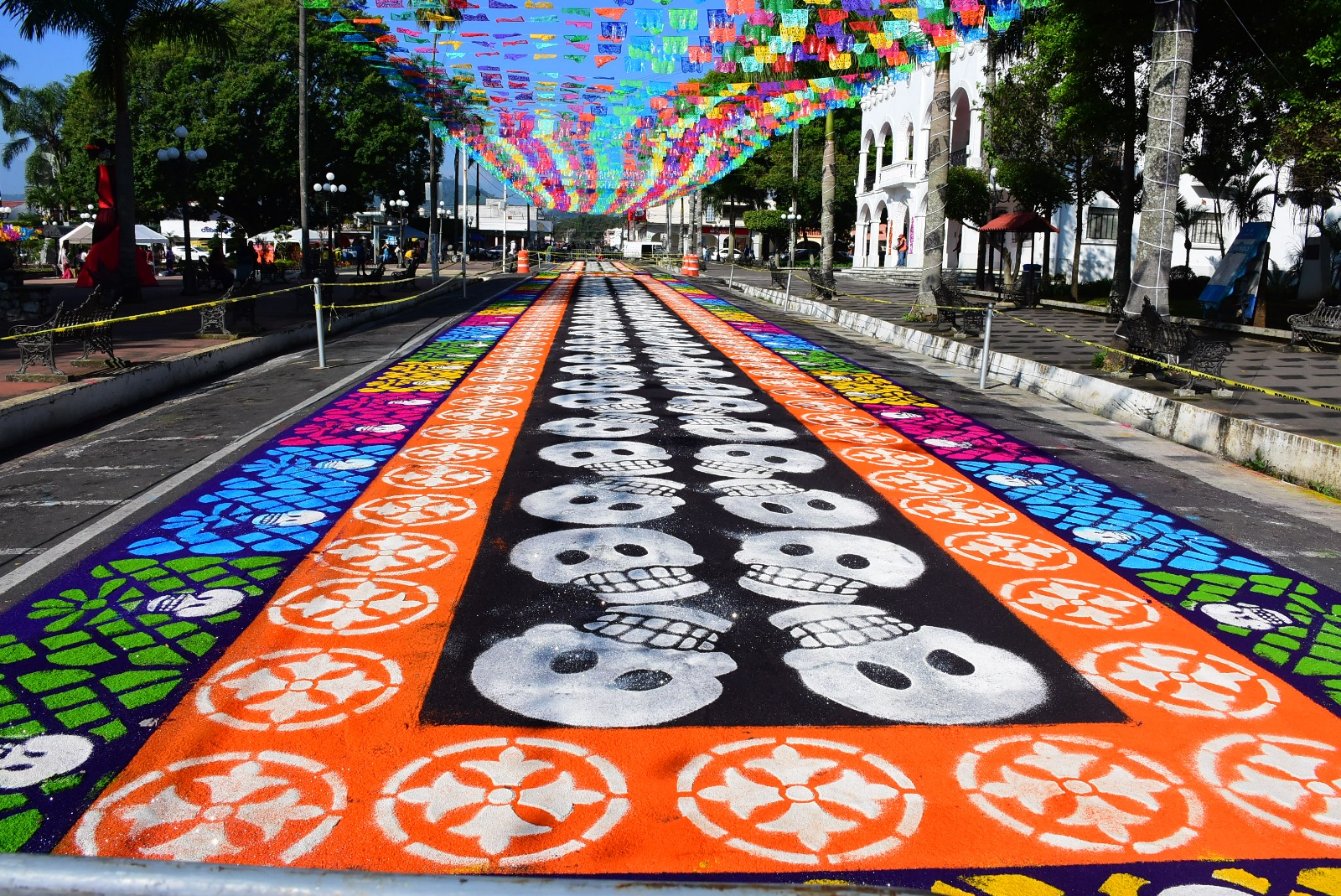 La avenida 3 entre calles 1 y 3, tiene un colorido especial para recibir a cientos de visitantes durante estos días de tradición de Todos Santos, a partir de hoy y hasta el sábado 2, permanecerá expuesto un tapete de aserrín que representa la tradición del municipio de Tlaxcala y plasma un camino de calaveras, simulando el regreso de las almas de los fieles difuntos como parte del misticismo durante esta época.