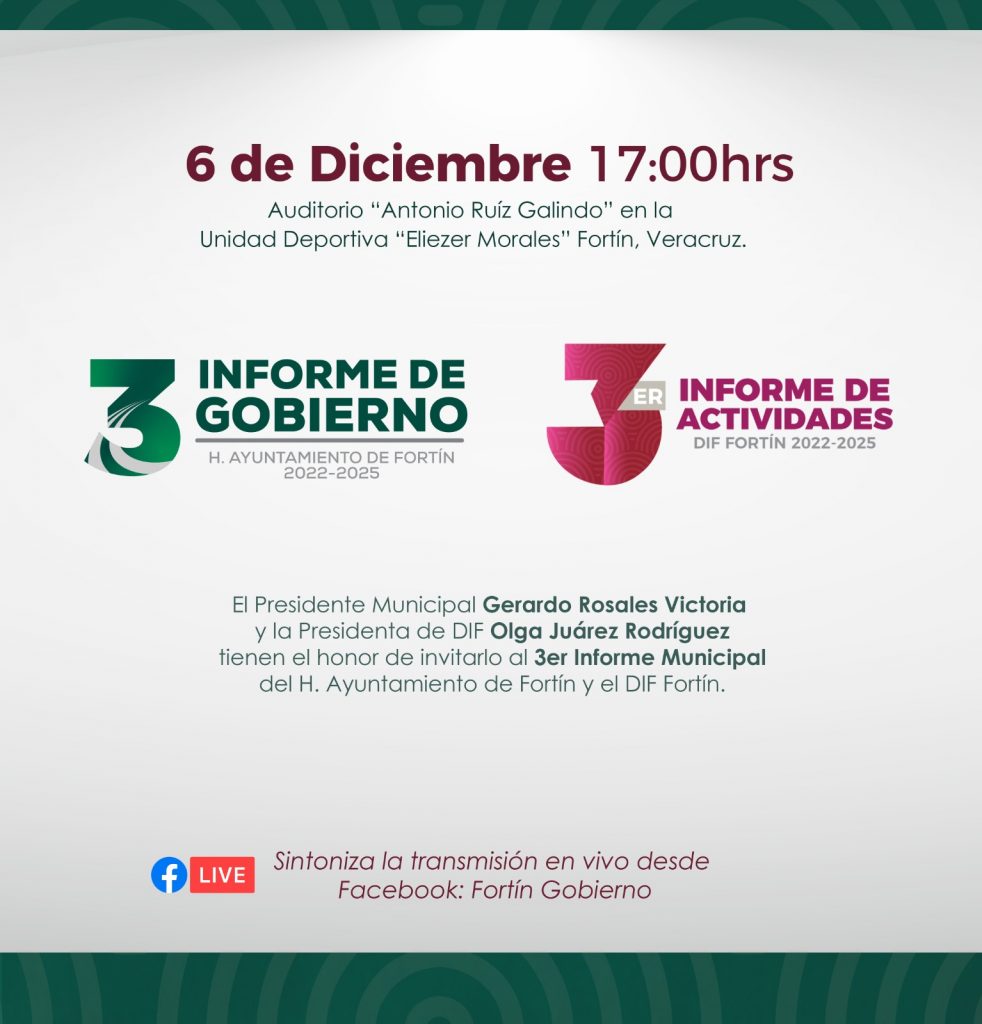 02 de diciembre de 2024, Fortín, Ver. – El próximo viernes 06 de diciembre a las 17:00 horas se llevará a cabo el evento del Tercer Informe de Gobierno por parte del presidente municipal Gerardo Rosales Victoria y a su vez, el Tercer Informe de Actividades de la presidenta del DIF Municipal, Sra. Olga Juárez Rodríguez.