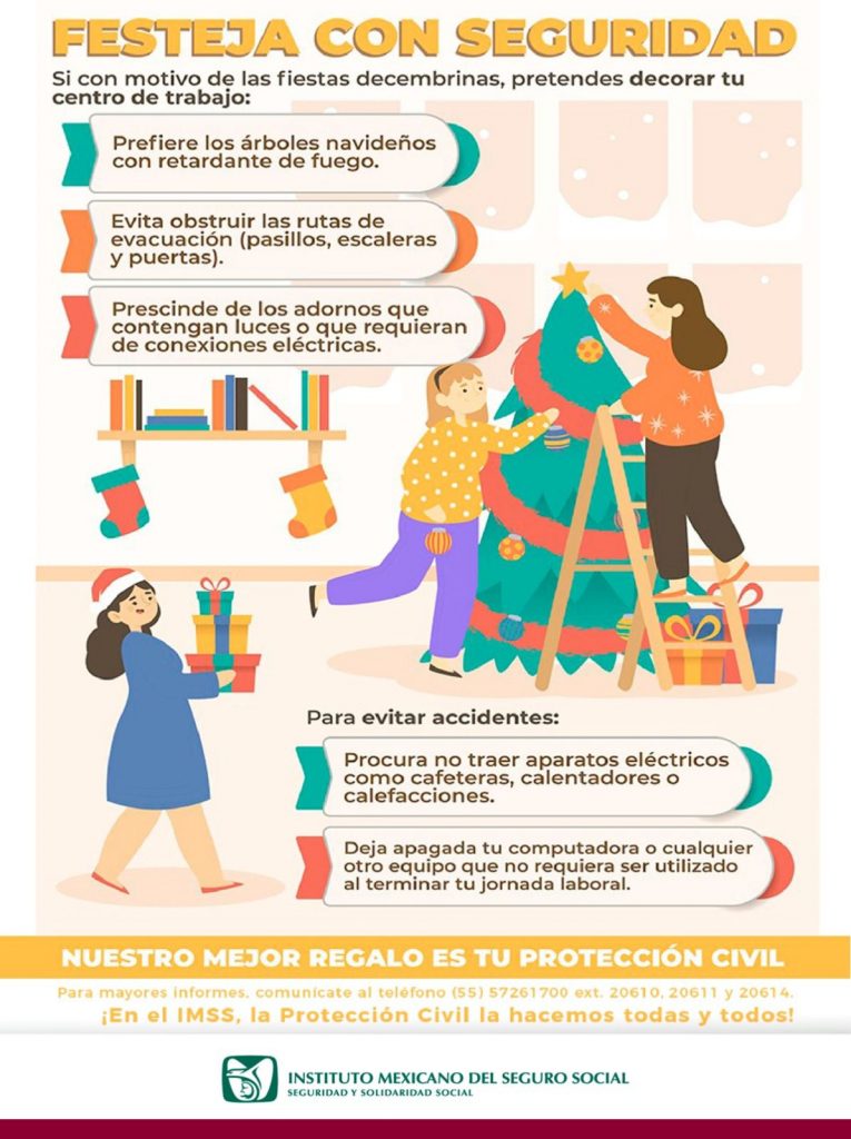 La decoración decembrina en casas, escuelas y centros laborales debe realizarse con todas las medidas de seguridad a fin de evitar accidentes, por ello el Instituto Mexicano del Seguro Social (IMSS) en Veracruz Sur exhorta a la población a revisar las instalaciones eléctricas, así como las series de luces y demás artículos para cerciorarse que se encuentran en condiciones apropiadas para su uso.