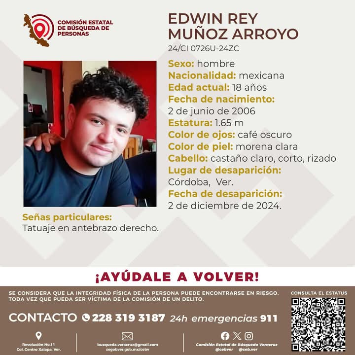 Córdoba, Ver.- Un joven identificado como Edwin rey Muñoz Arroyo, es reportado por la Comisión Estatal de búsqueda Veracruz cómo desaparecido el pasado día 2 del presente mes, tras ser…