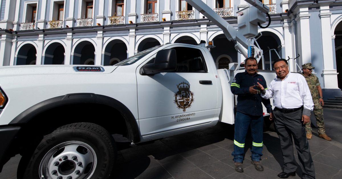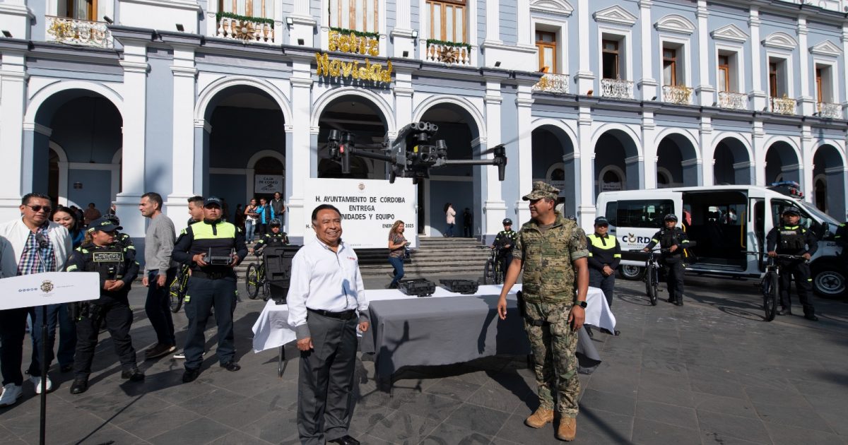 Córdoba Ver. a 03 de enero de 2025.- Esta mañana en la explanada del parque 21 de mayo, autoridades municipales encabezadas por el alcalde Juan Martínez Flores, hicieron la entrega de equipamiento consistente en una grúa para el área de Alumbrado Público, así como de dos drones, 18 bicicletas y una camioneta van, al departamento de Seguridad y Protección Ciudadana.