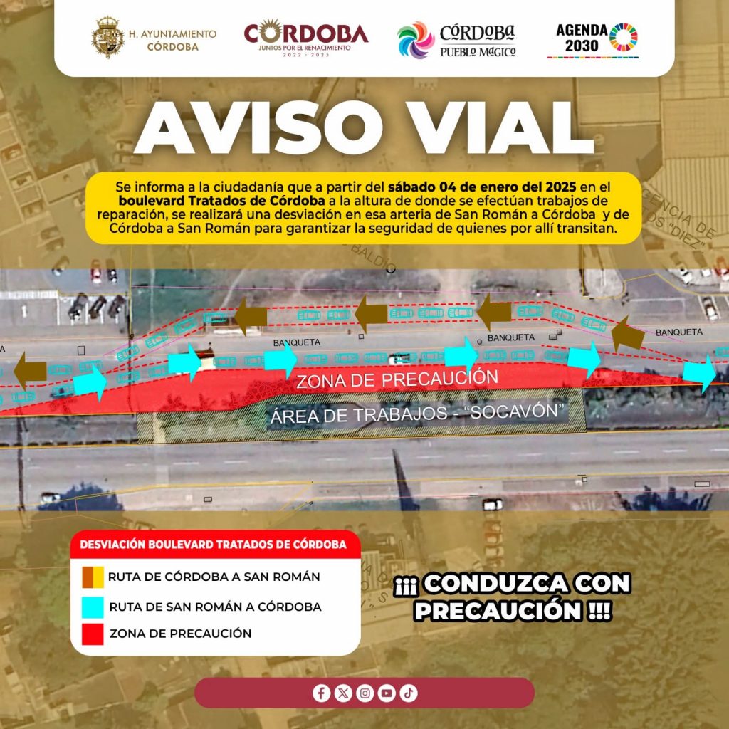 Córdoba, Ver.- Toda vez que este sábado 4 de enero dan inicio de las obras para la rehabilitación del bulevar Tratados de Córdoba, se ha determinado implementar una desviación para el tránsito ligero y del transporte público de pasajeros.