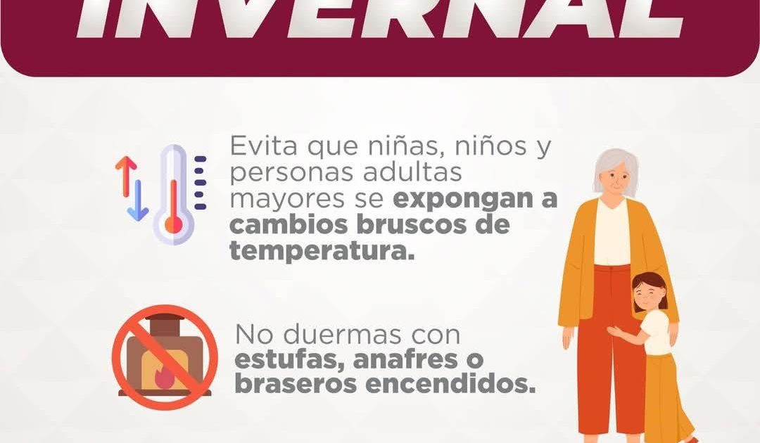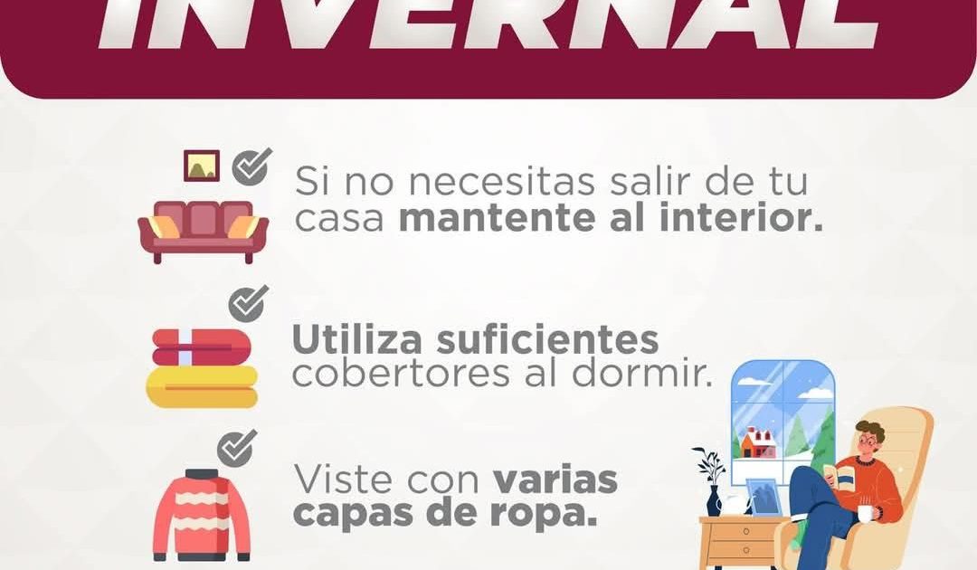 Las recomendaciones para esta temporada invernal son, que, si no se necesita salir de su casa, se mantenga en el interior, utilicen suficientes cobertores al dormir y vistan con varias capas de ropa, eviten que niñas niños y personas adultas mayores se expongan a cambios bruscos de temperatura, y por supuesto no dormir con estufas, naves o braceros encendidos.