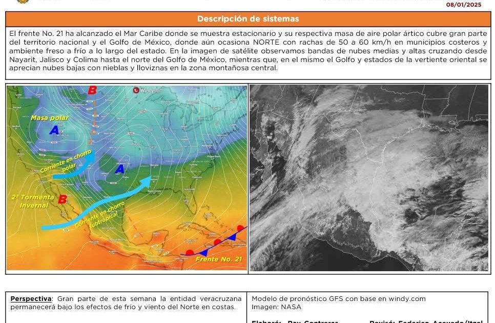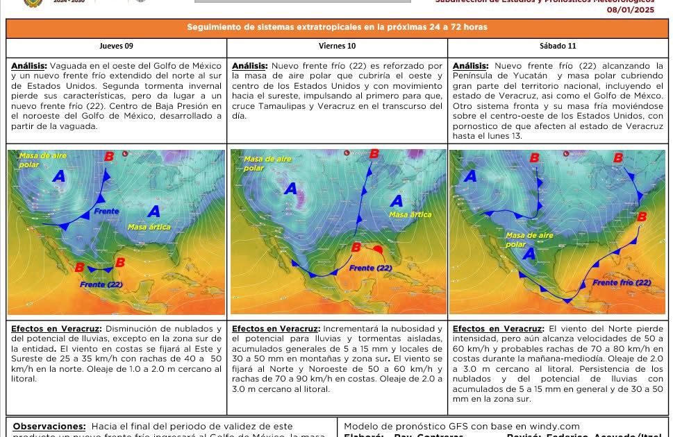 El sábado 11 de enero alcanzará la península de Yucatán con pronósticos que afecten el estado de Veracruz hasta el lunes 13, detalló Tress Martínez.