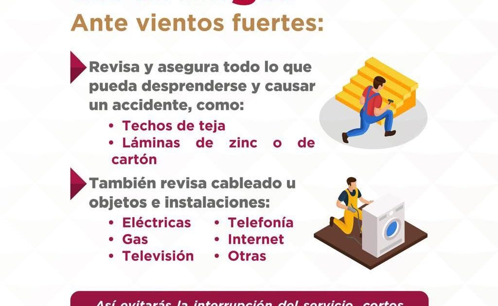 “Se sugiere a los ciudadanos tener precauciones ante vientos fuertes, revisar y asegurar todo lo que pueda desprenderse y causar un accidente como techos, láminas de cartón, también revisar cableado, objetos de instalaciones eléctricas, gas, televisión, telefonía, internet, entre otras, para evitar la interrupción de los servicios, los cortos circuitos, las fugas, las explosiones, los incendios, golpes u otro tipo de daños en las viviendas o a quienes habiten en ellas”, aseveró.