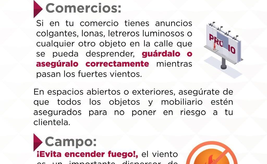 Agregó que en el campo o espacios abiertos, se recuerda evitar encender fuego, ya que el viento es un importante dispersor de incendios forestales, agrícolas y urbanos. Hay que prepararse, dar aviso a las autoridades municipales, si ubican árboles muertos o ramas secas con riesgo de caer.