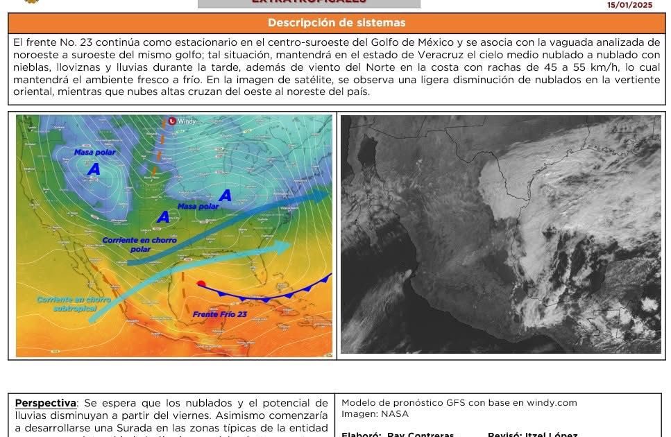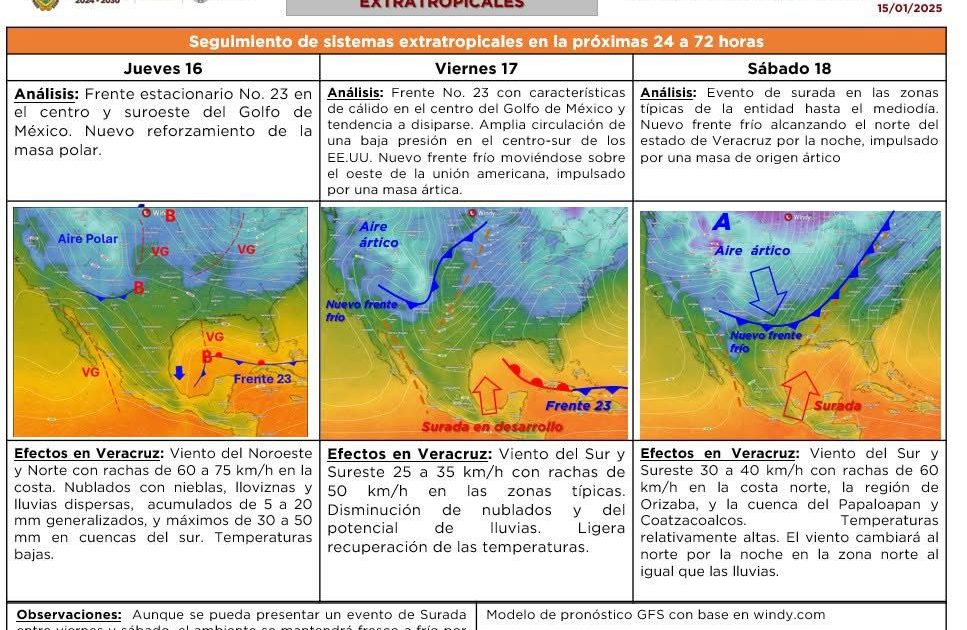 Córdoba Ver. a 15 de enero de 2025.- El Ayuntamiento de Córdoba a través de la coordinación de Protección Civil informó que esta semana tenemos la presencia del frente frío No. 23, combinado con un evento de Surada que podría llegar el fin de semana y para el lunes el ingreso del posible nuevo frente frío No. 24.