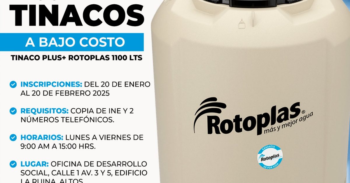 Este programa consta de la dotación de tinacos rotoplas de 1100 Litros y todos aquellos que deseen adquirirlos al costo de 2450 pesos, pueden inscribirse en las oficinas mencionadas en horario de 9 a 15 horas y tendrán hasta el próximo 20 de febrero para hacerlo.