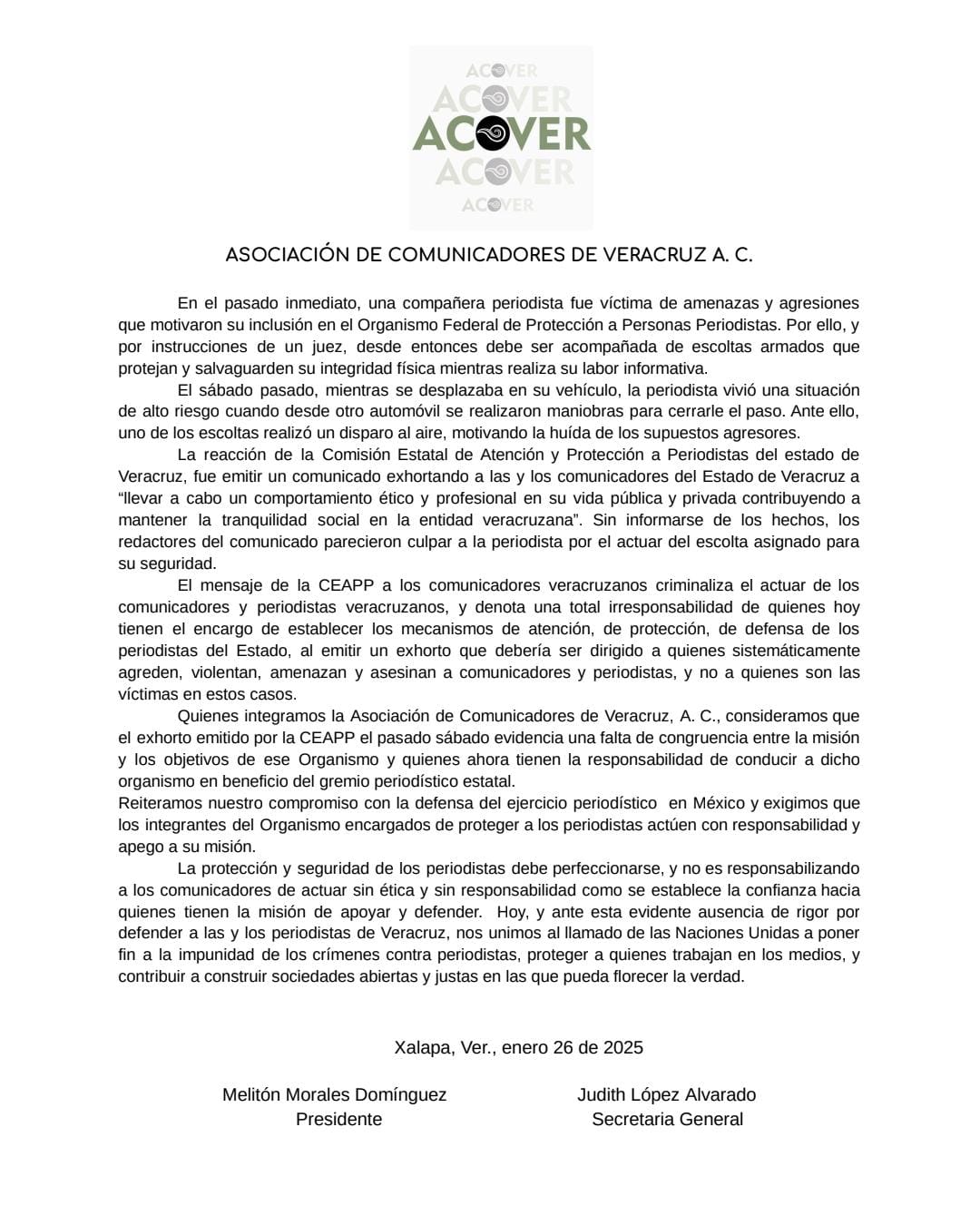 La Asociación de Comunicadores de Veracruz (ACOVER) que preside Melitón Morales, hizo público su pronunciamiento ante el comunicado de la Comisión Estatal para la Atención y Protección de Periodistas (CEAPP),…