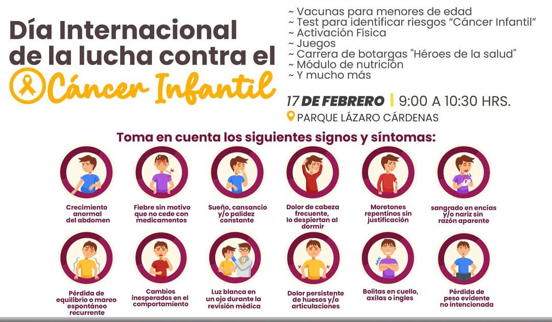 El DIF Municipal de Fortín en coordinación con la Unidad de Salud IMSS Bienestar, antes Centro de Salud, invitan al público en general a participar en la Jornada de salud, en el marco del Día Internacional del Cáncer Infantil con la finalidad de concientizar sobre los signos y síntomas para prevenir el cáncer infantil, en donde contaremos con los siguientes servicios.