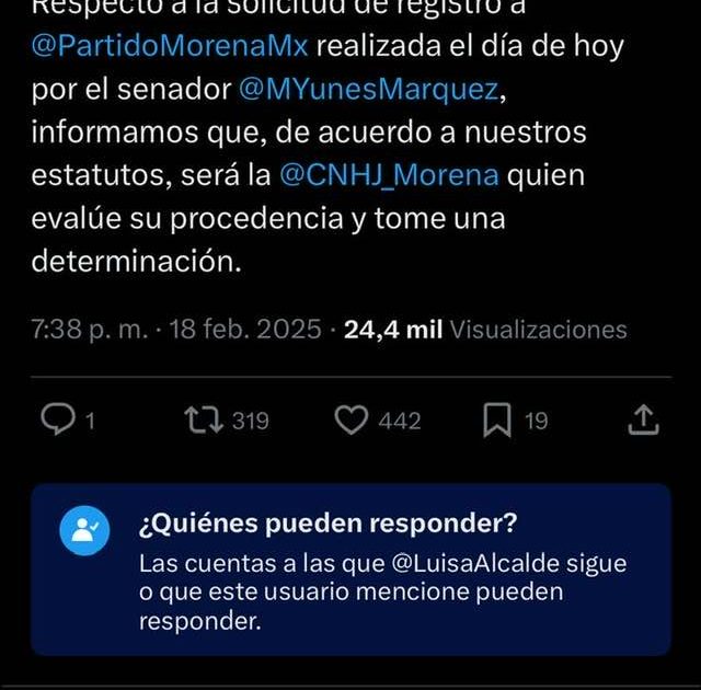 “Respecto a la solicitud de registro a @PartidoMorenaMx realizada el día de hoy por el senador @MYunesMarquez, informamos que, de acuerdo a nuestros estatutos, será la @CNHJ_Morena quien evalúe su procedencia y tome una determinación”, escribió.