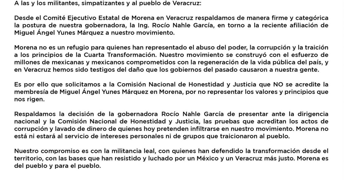 Xalapa, Ver. 18 febrero 2025.- La gobernadora de Veracruz, Rocío Nahle García, pidió a la Comisión de Honestidad y Justicia del Movimiento de Regeneración Nacional (Morena) que no sea afiliado Miguel Ángel Yunes Márquez a este partido político.
