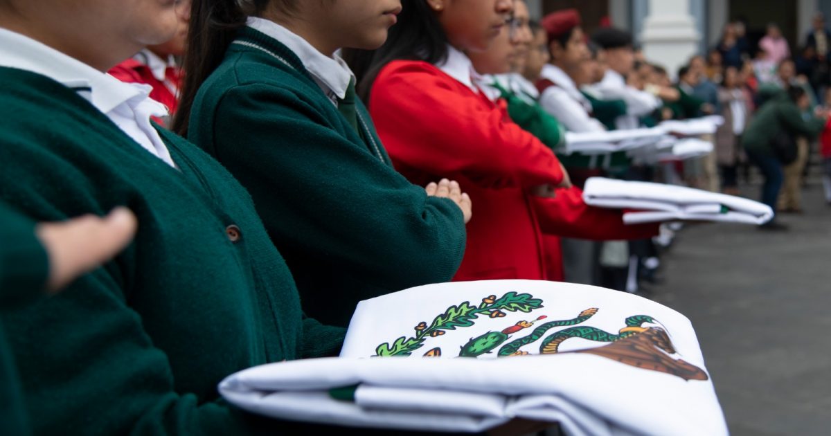 El evento se efectuó en la plaza cívica de la ciudad, en donde, la primera autoridad acompañado del cuerpo edilicio, realizó el abanderamiento a la escolta integrada por estudiantes de la Telesecundaria Vicente Guerrero de El Porvenir.