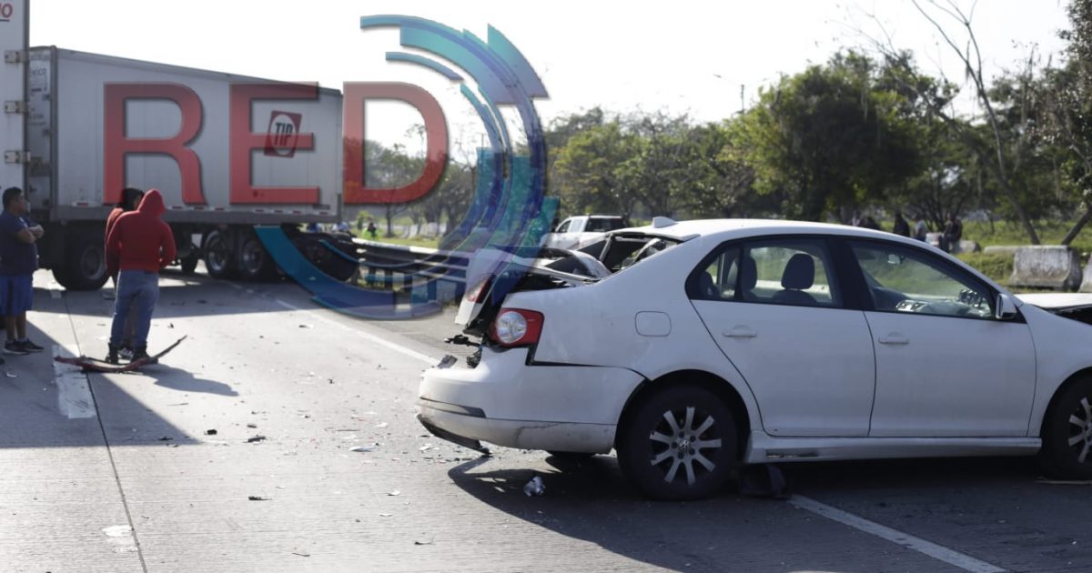Asimismo, se sumaron un vehículo Kia Río de color gris con placas YJK-853-B, un Nissan March de color blanco con placas XZT-261-C, un vehículo Ford Fiesta con placas YJC-637-B, un tractocamión Freightliner de color blanco con caja seca y otro tractocamión Freightliner de color vino con razón social Transportes Medrano y número económico 1592, el cual presumiblemente fue el responsable; mismo que, en la parte trasera, dejó otros dos vehículos dañados: un vehículo Jetta blanco con placas YNK-439-B, el cual quedó en las barras metálicas, y un Chevrolet Aveo de color gris con placas L-72-BGY del Estado de México.