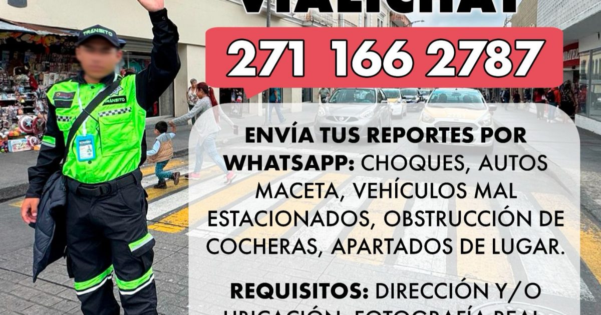 Asimismo, al número 271 166 2787, podrán reportar los accidentes viales, siendo ellos la autoridad competente para fungir en tema de vialidad mediante la jefatura de peritos. Además de, reportes por autos maceta, vehículos mal estacionados y apartados en lugar prohibido.