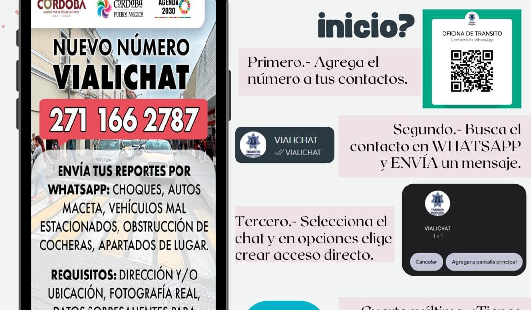Córdoba, Ver. 02 de marzo de 2025.- La Dirección de Tránsito Municipal y Seguridad Vial pone a disposición de la ciudadanía el nuevo número del “Vialichat”, donde podrán reportar al número 271 166 2787 todo lo relacionado con los sucesos que resulten derivados de la vialidad o transeúntes.