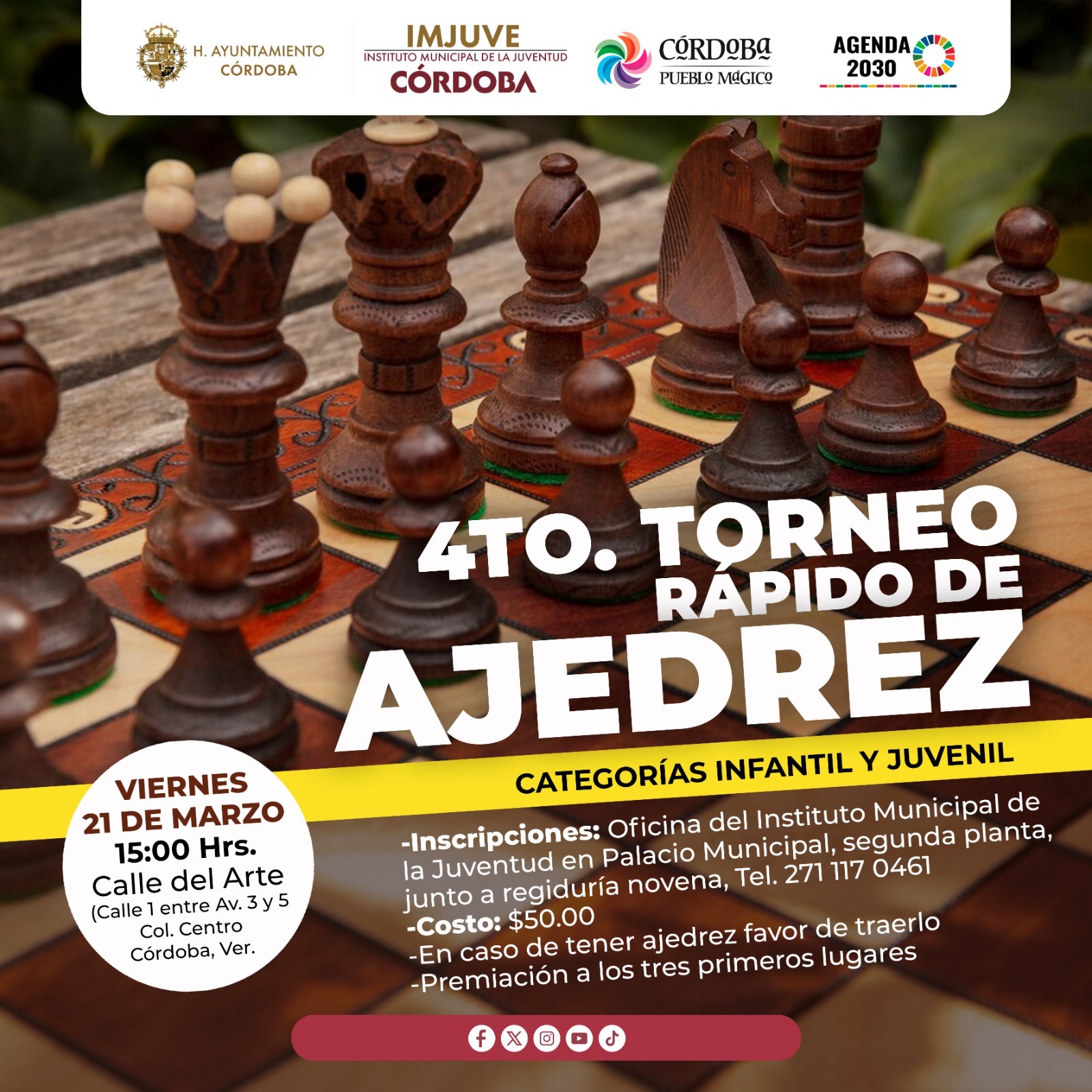 Córdoba, Ver., 14 de marzo de 2025.- El próximo 21 de marzo, se llevará a cabo el Cuarto Torneo de Ajedrez Rápido organizado por el Instituto Municipal de la Juventud,…