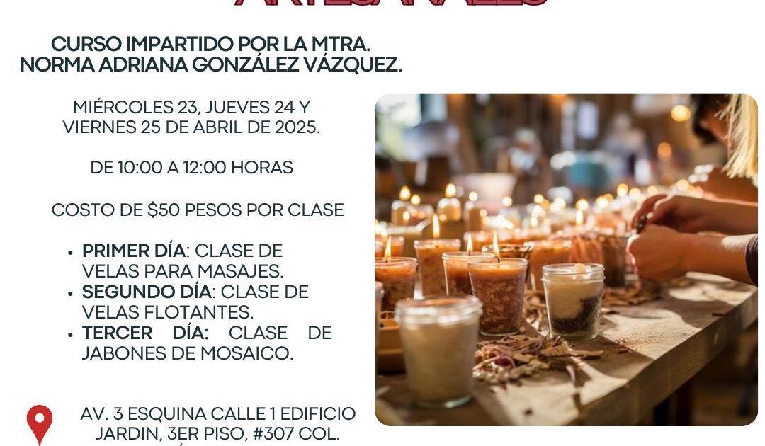 El taller constará de tres días de clase de 10:00 a 12:00 horas, impartido en las oficinas del IMMUJERES por la Mtra. Norma Adriana González Vázquez. Abordarán diferentes alternativas del producto como velas para masajes, flotantes y jabones de mosaico. El costo por clase será de 50 pesos y el cupo es limitado.
