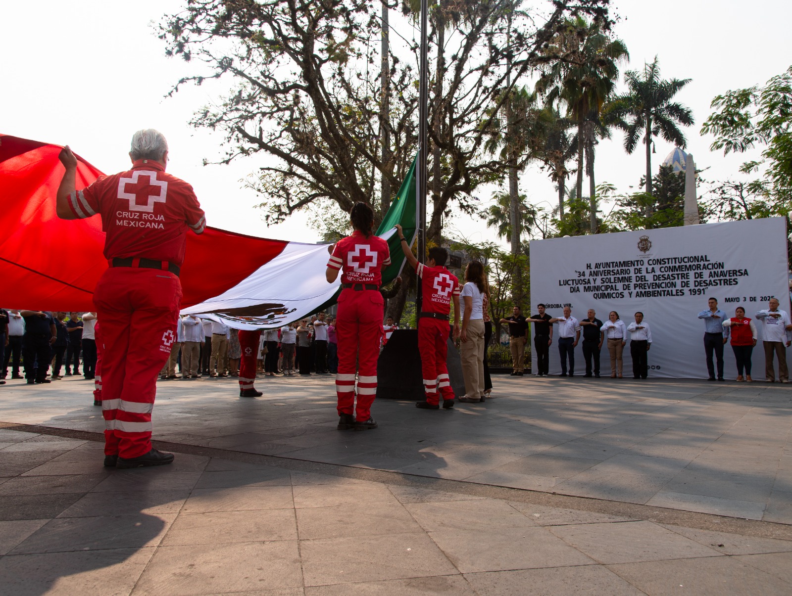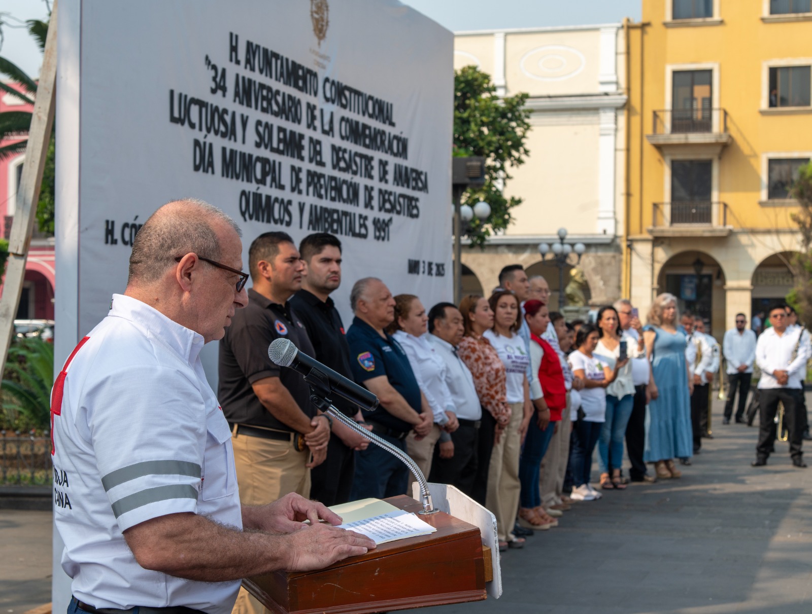 Córdoba, Ver., 03 de mayo de 2025.-Reunidos en la plaza cívica, autoridades municipales, integrantes de la Cruz Roja Mexicana delegación Córdoba y representantes de la sociedad civil llevaron a cabo en acto cívico con motivo del 34 aniversario de la conmemoración luctuosa y solemne del desastre de Anaversa, así como el Día Municipal de Prevención de Desastres Químicos y Ambientales 1991.