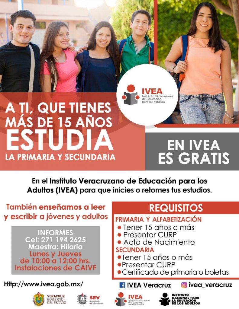 Informes al número telefónico 2711942625, solo basta que quieras concluir tus estudios. Recuerda que el CAIVF está ubicado en avenida 5 entre calles 3 y 5, colonia Centro.