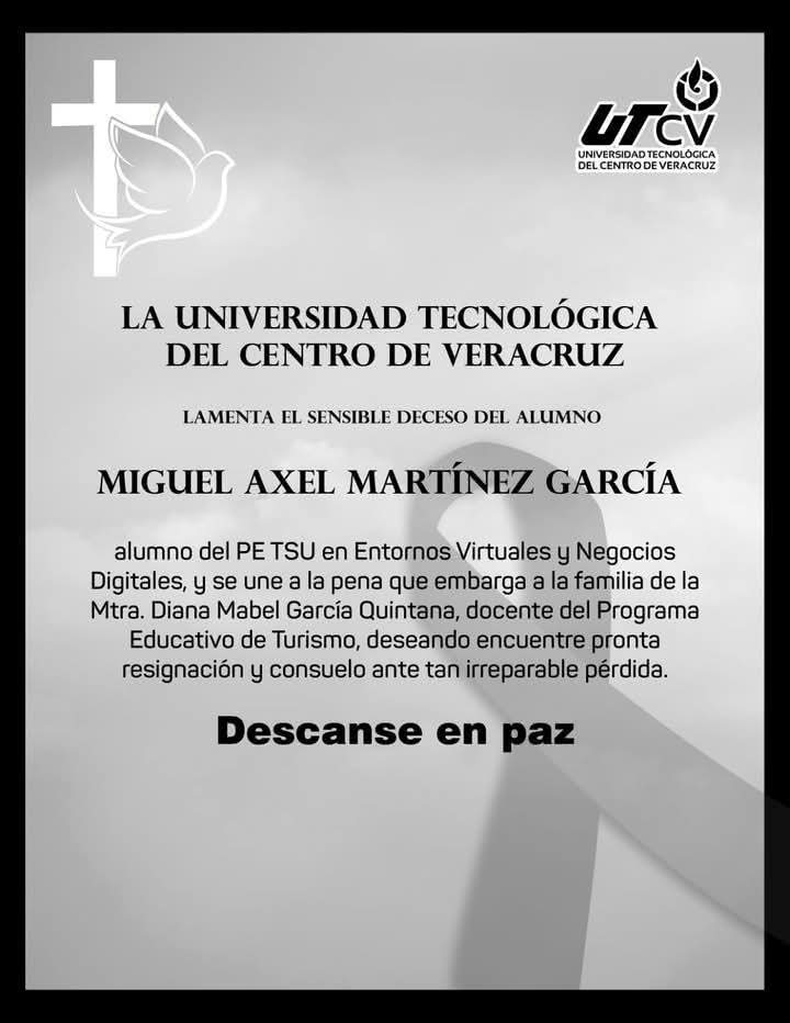 Cuitláhuac, Ver. – La comunidad estudiantil de la Universidad Tecnológica del Centro de Veracruz (UTCV) se encuentra de luto tras la muerte de uno de sus alumnos, Miguel Axel Martínez García, de 19 años, quien falleció este martes 27 de mayo como consecuencia de un aparatoso accidente automovilístico registrado en la carretera federal Cuitláhuac–La Tinaja.