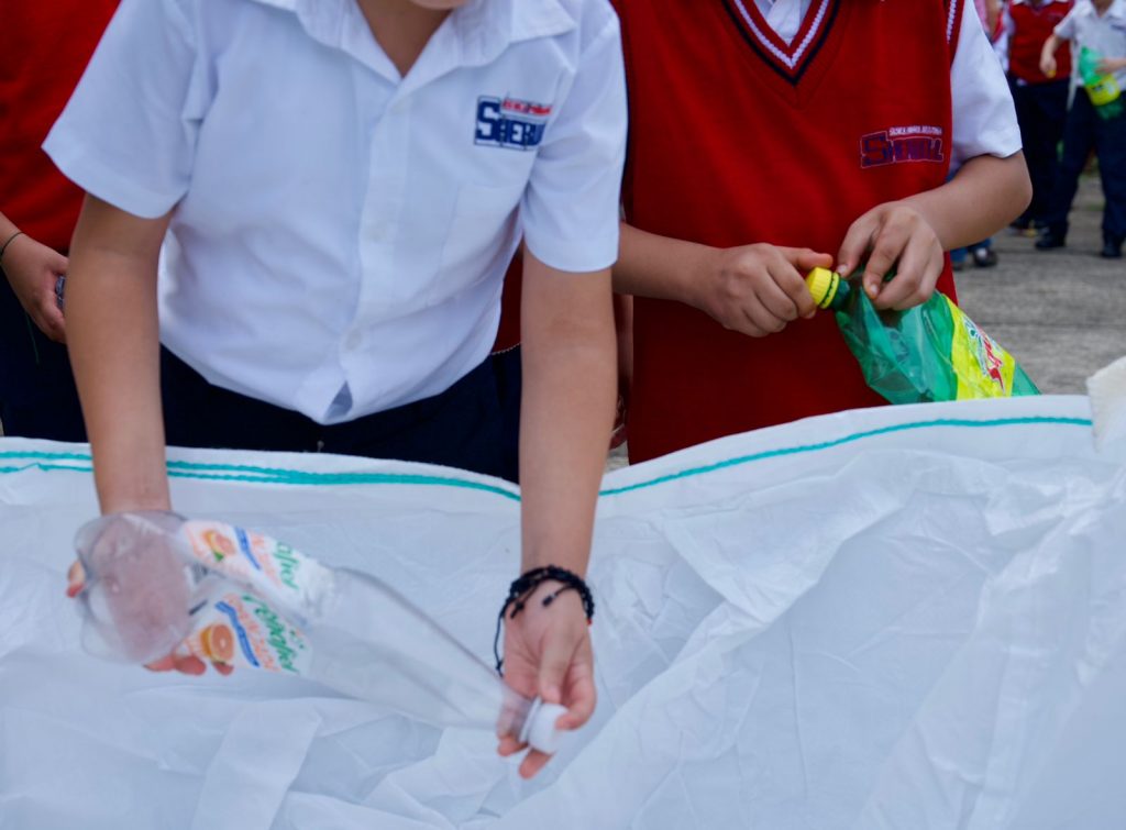 Durante este acto, los estudiantes de la escuela primaria Guillermo A. Sherwell depositaron botellas de plástico en un contenedor, como muestra y recordatorio de evitar que estos residuos lleguen a los cuerpos de agua o alcantarillas de la ciudad.